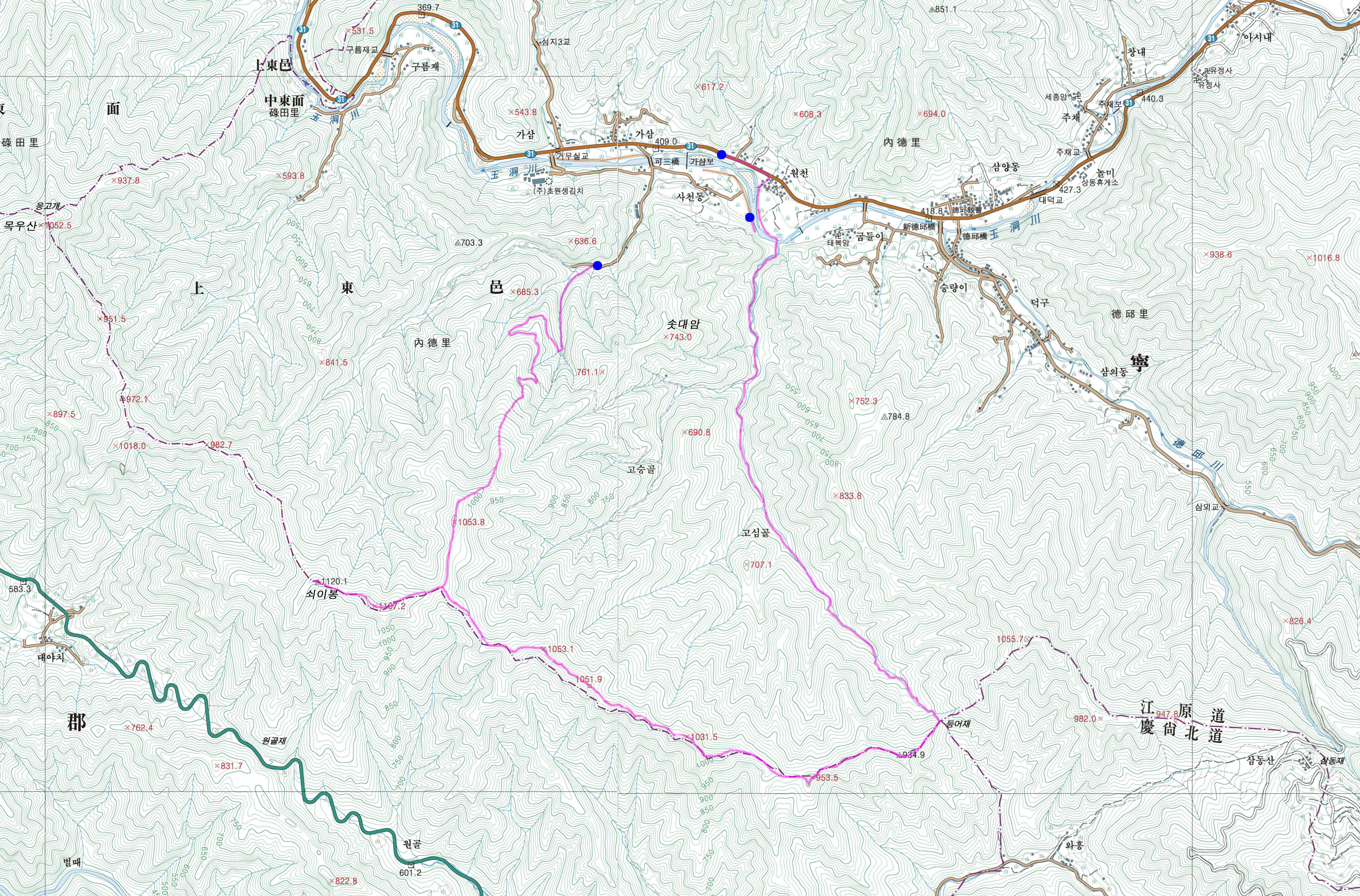 원천/31국도변-고심골-등어치-△934.9-×953.5-×1031.5-×1051.9-×1053.1-×1053.8갈림-쇠이봉(△1120.1)왕복