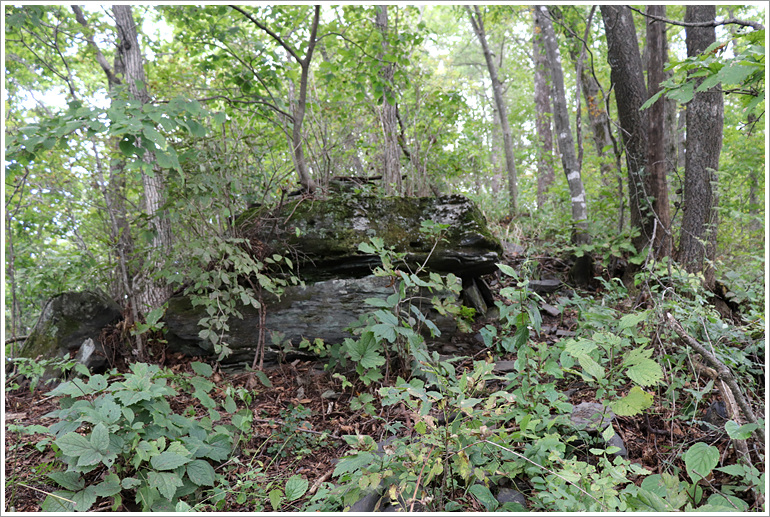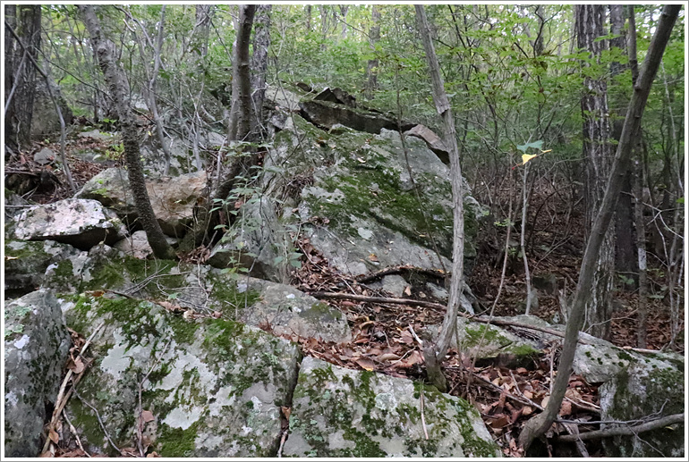 (이 바위가 있는 지점에서 사면길 버리고 적당히 산길 만들어 치고 오른다)