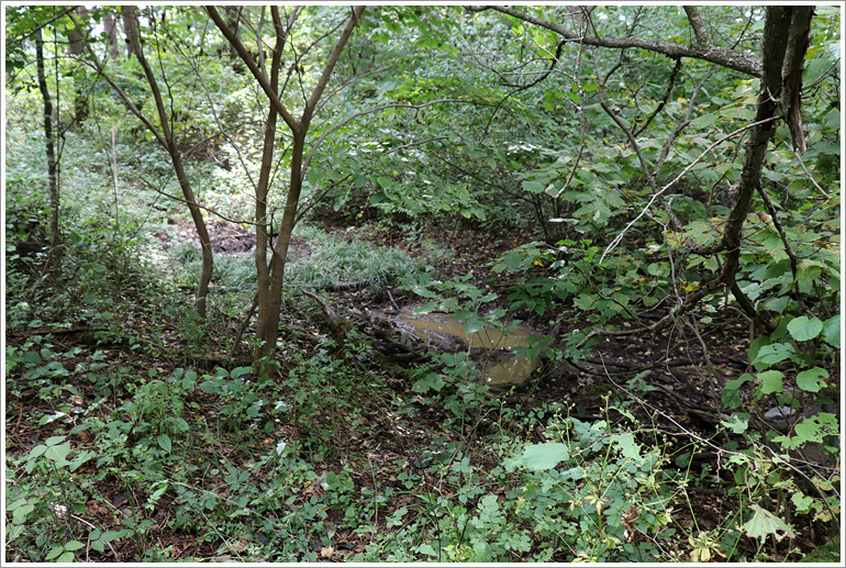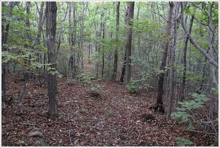(도랑도 만나고... 좌측으로 짧은 지능선이 갈리는 지점으로 우측으로 꺾어 진행해야 한다)