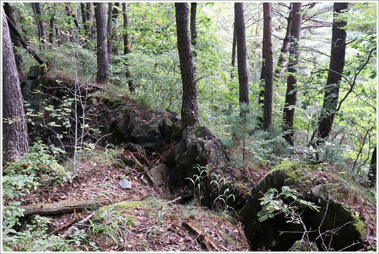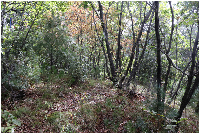 (잘 나 있는 산길은 잠시 후 접하는 묘지에서 끝나고 이후는 인적이 거의 지나가지 않은 희미한 산길)