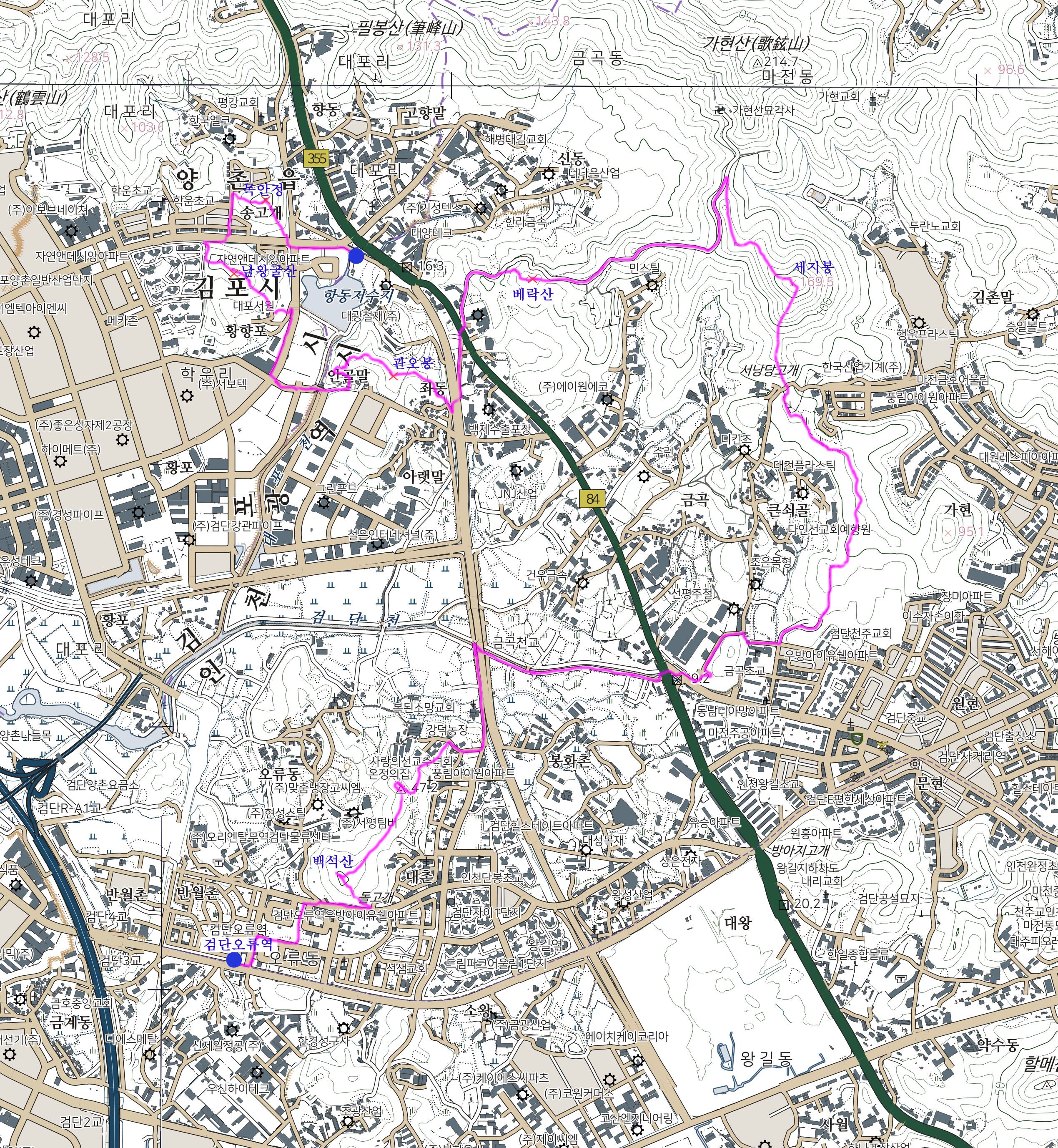 오류동/검단오류역-돌고개-백석산-△47.2-금곡천교-검단천-금곡초교-서낭당고개-세자봉(×169.5)-베락산