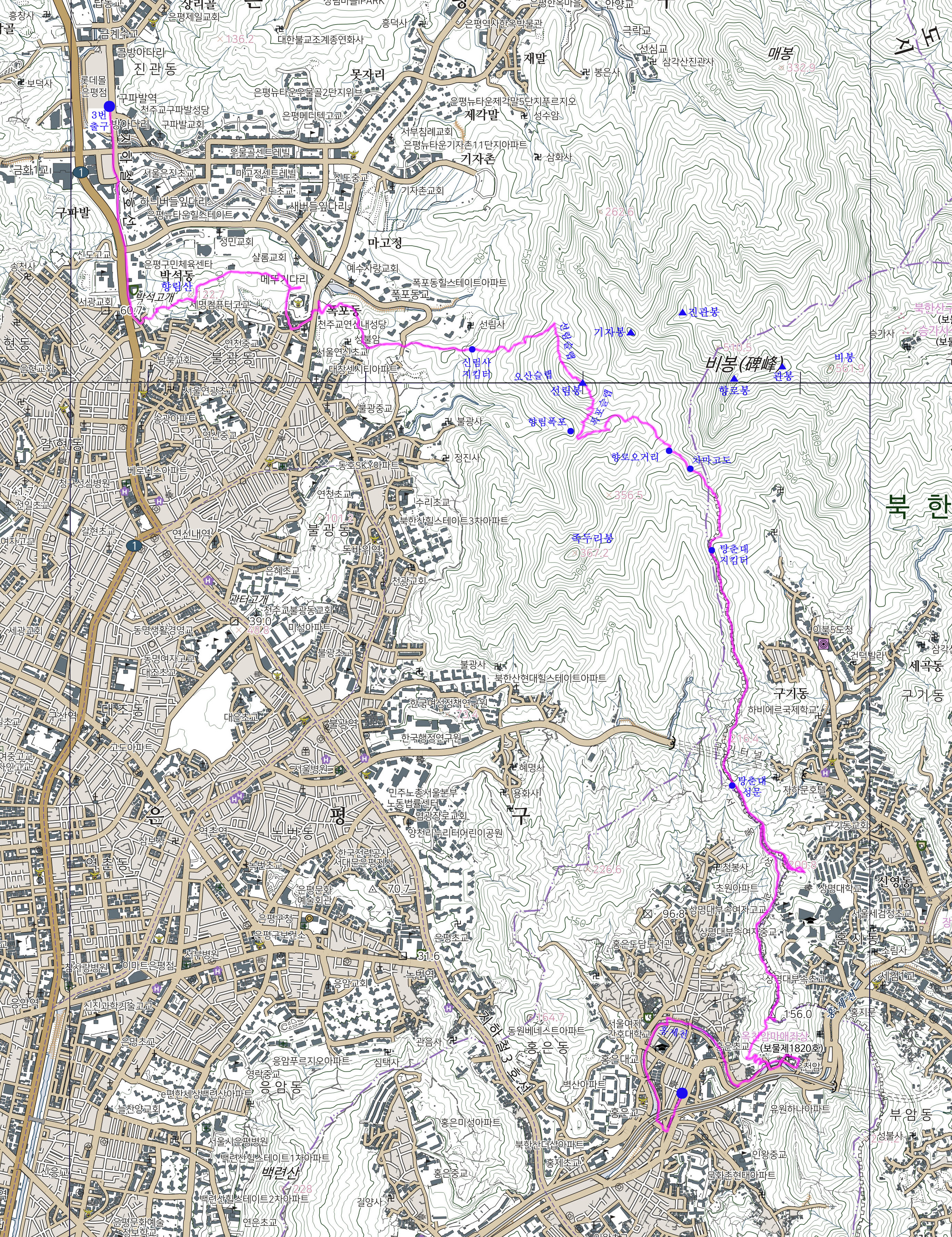 구파발역/3번출구(08:46)-박석고개근린공원(08:53)-백석고개(08:59)-은평소방서(09:01)-향림근린공원(09:05)