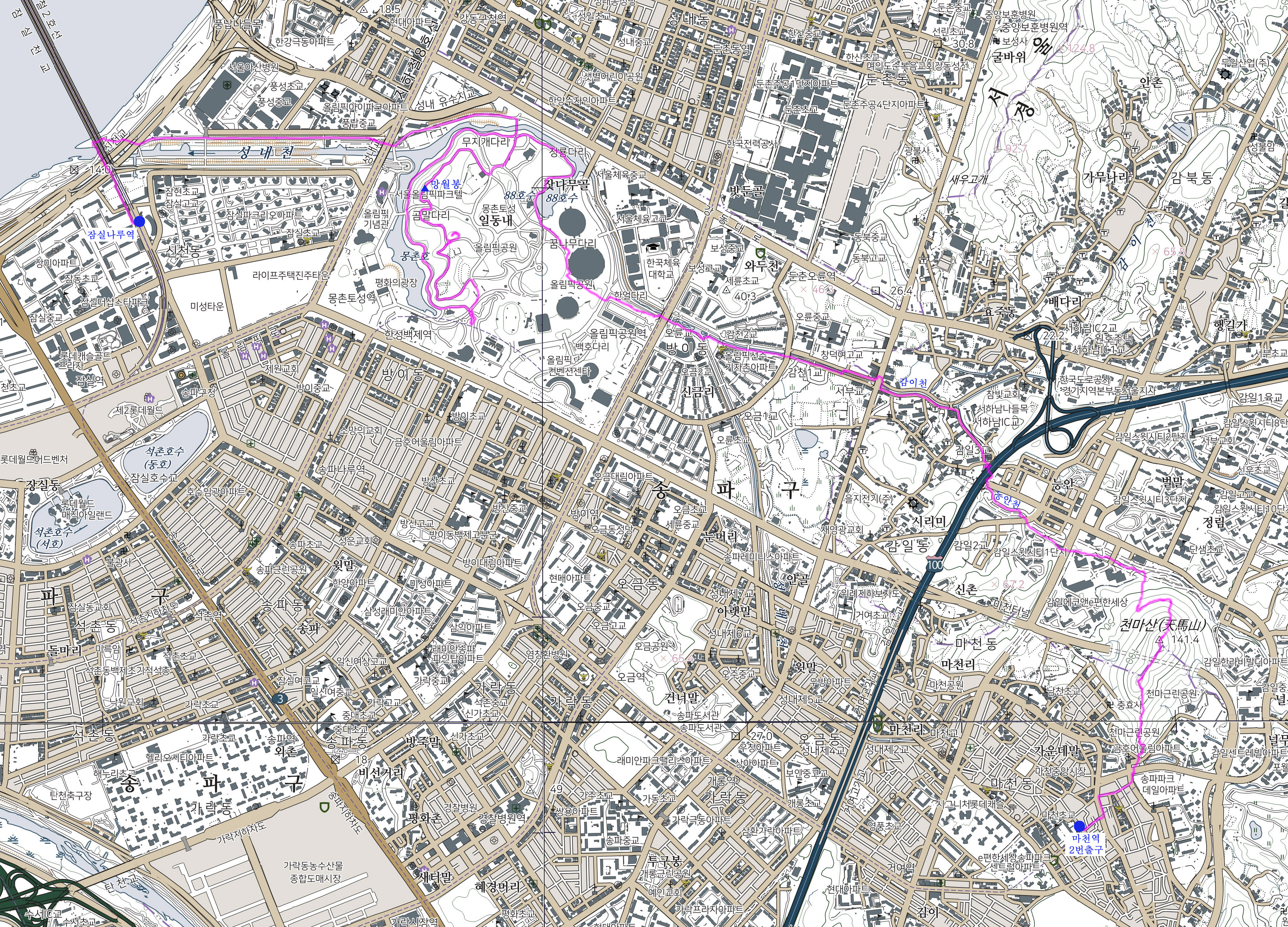 일단 천마산부터 답사한 뒤 올림픽공원까지는 능안천과 감이천을 경유하기로 했고