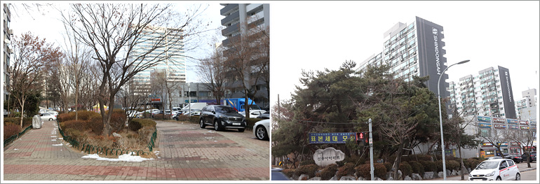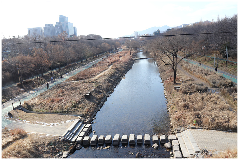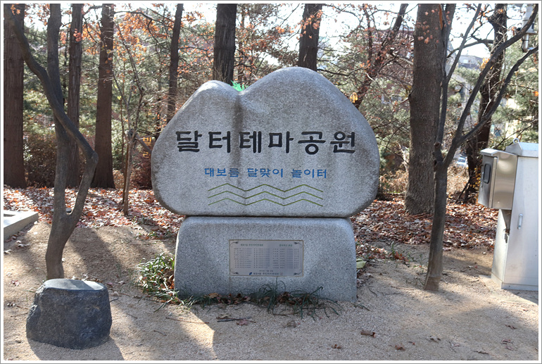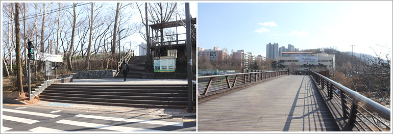 (양재천 보행자교를 건너 저 앞에서 좌측으로 들어서면 달터근린공원 입구이다)