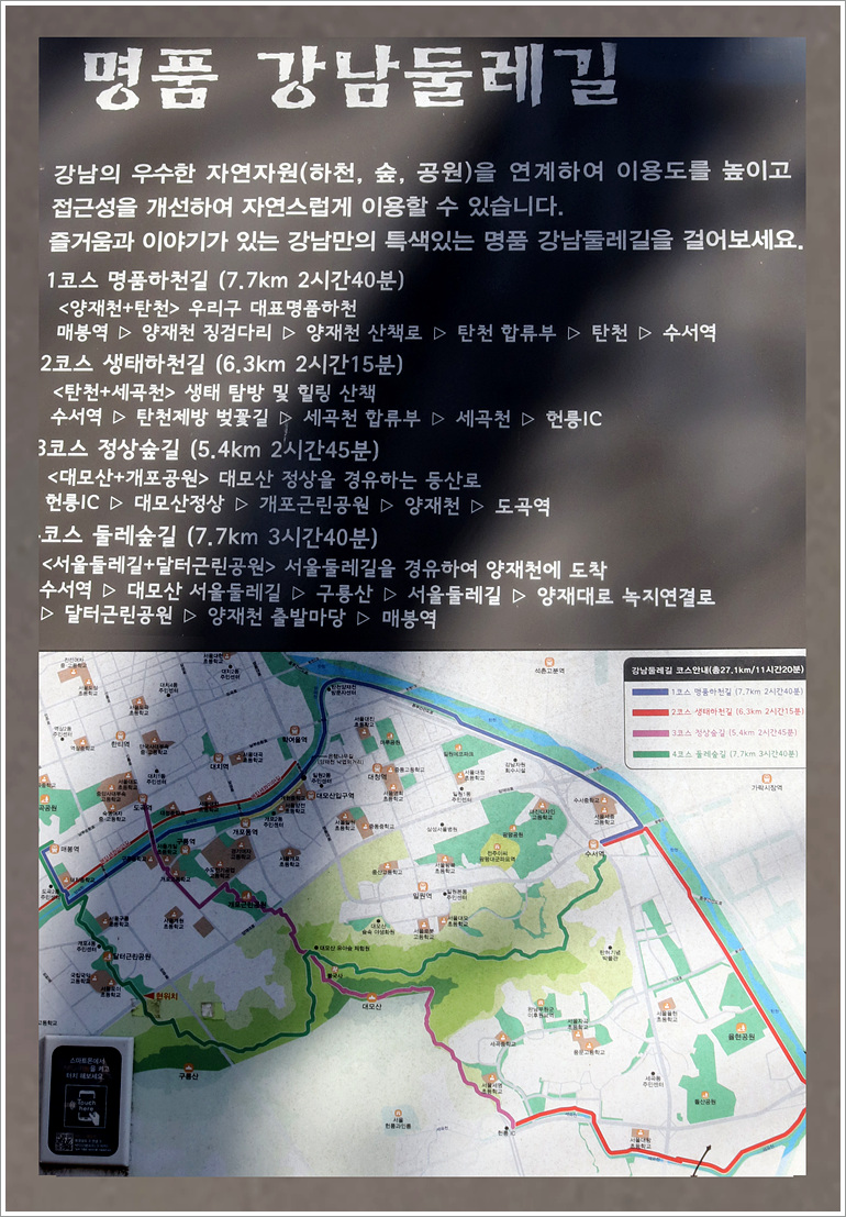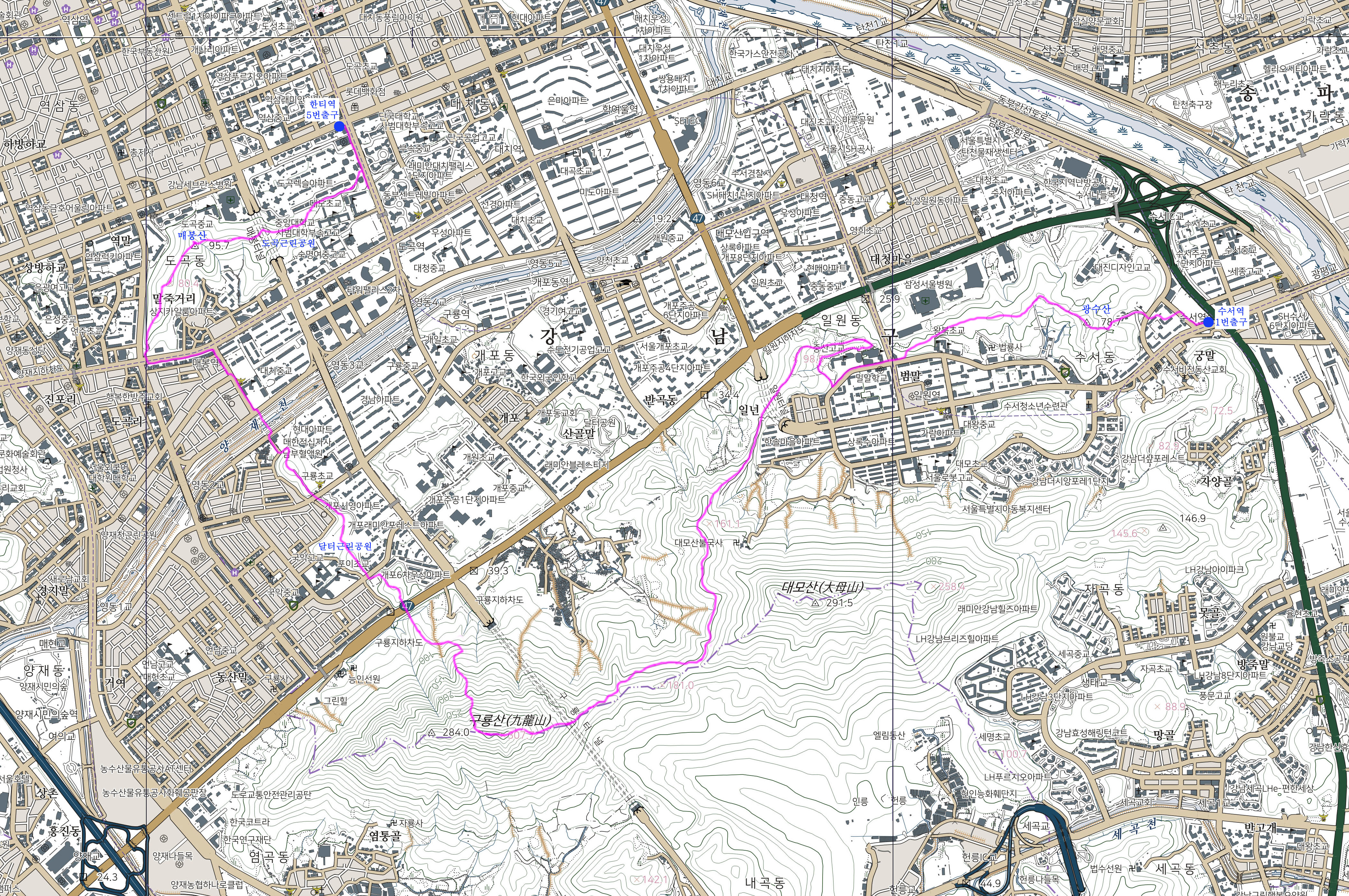 한티역-도곡근린공원-매봉산(△95.7)-×80.4-양재전화국사거리-매봉역-양재천-달터근린공원-구룡산(×307.7)