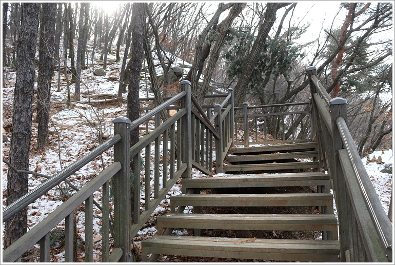 (한 굽이 올라서니 서울둘레길도 새로 조성된 계단을 따라 올라오네)