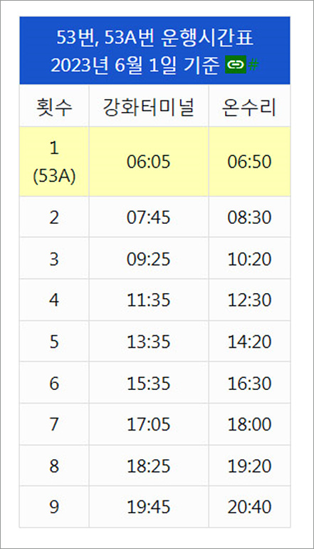 (버스 시간표... 강화터미널에서 갑곶돈대까지 10분 정도 소요된다)