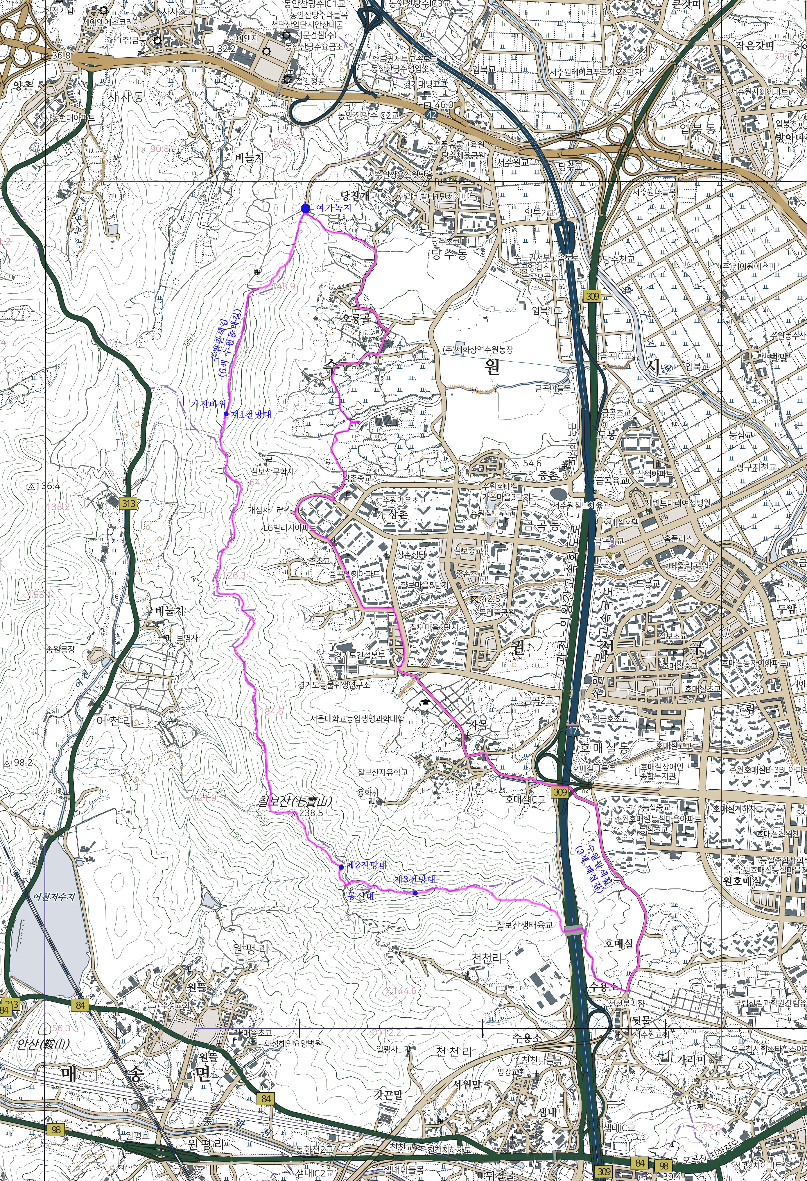 -통신대안부-제3전망대-생태육교-호매실-수원팔색길/3색/매실길-호매실IC-자목마을-상촌초교-오룡골-여가녹지