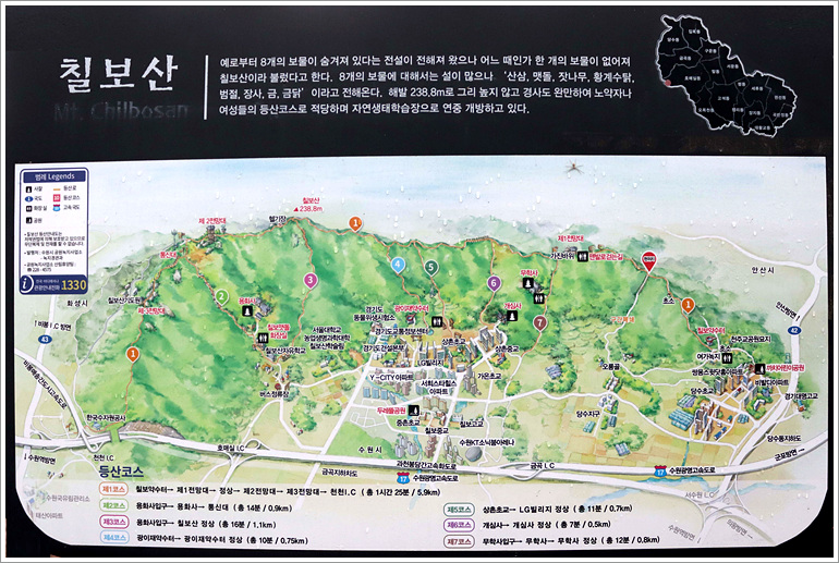 마루금애 해당되면서 수원팔색길 6색 수원둘레길이 지나는 칠보산 능선을 종주한