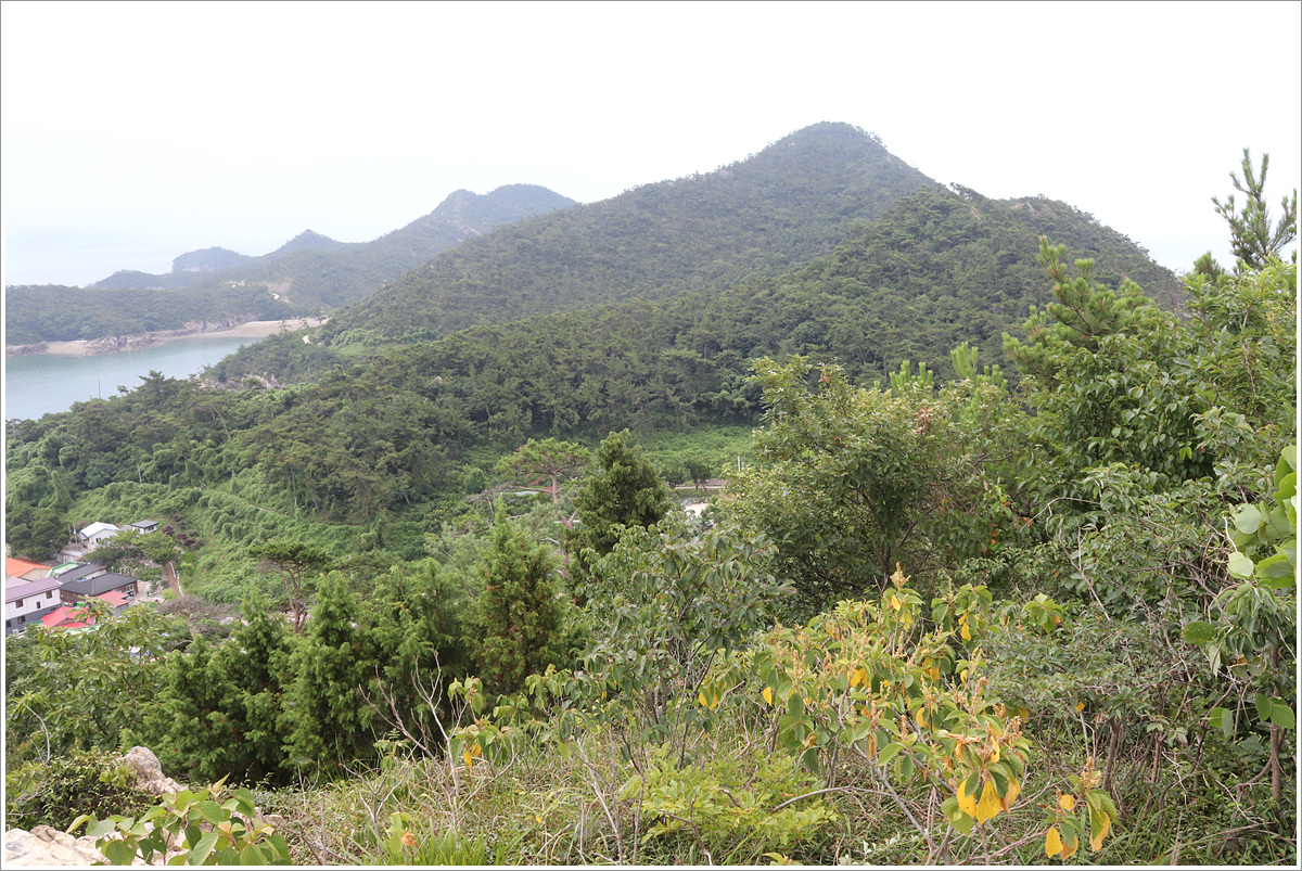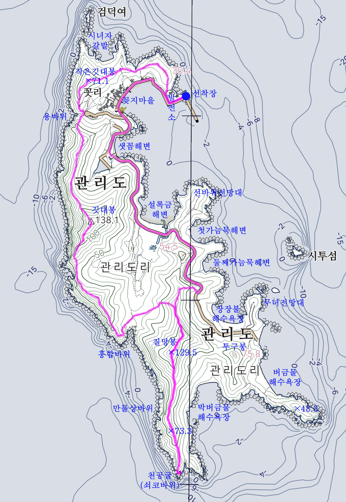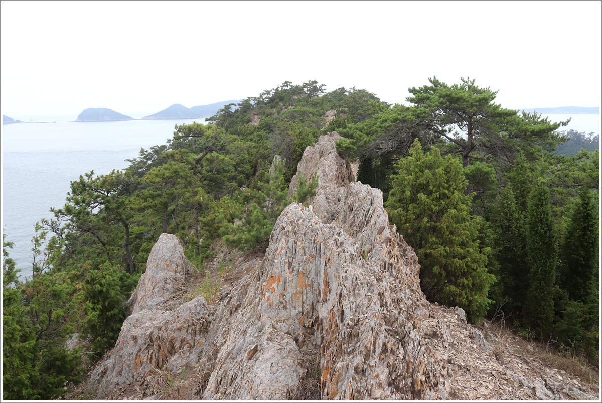 선착장-×30.4-작은깃대봉(×71.1)-낙조전망대-용바위-깃대봉(△138.1)-홍합바위-질망봉(×129.5)-×73.3