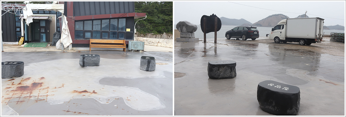 (대기실은 공사 중... 앞마당에 관리도를 대표하는 깃대봉-질망봉-투구봉 표지석이 있다)