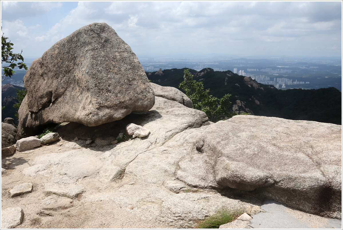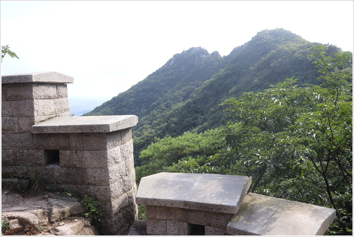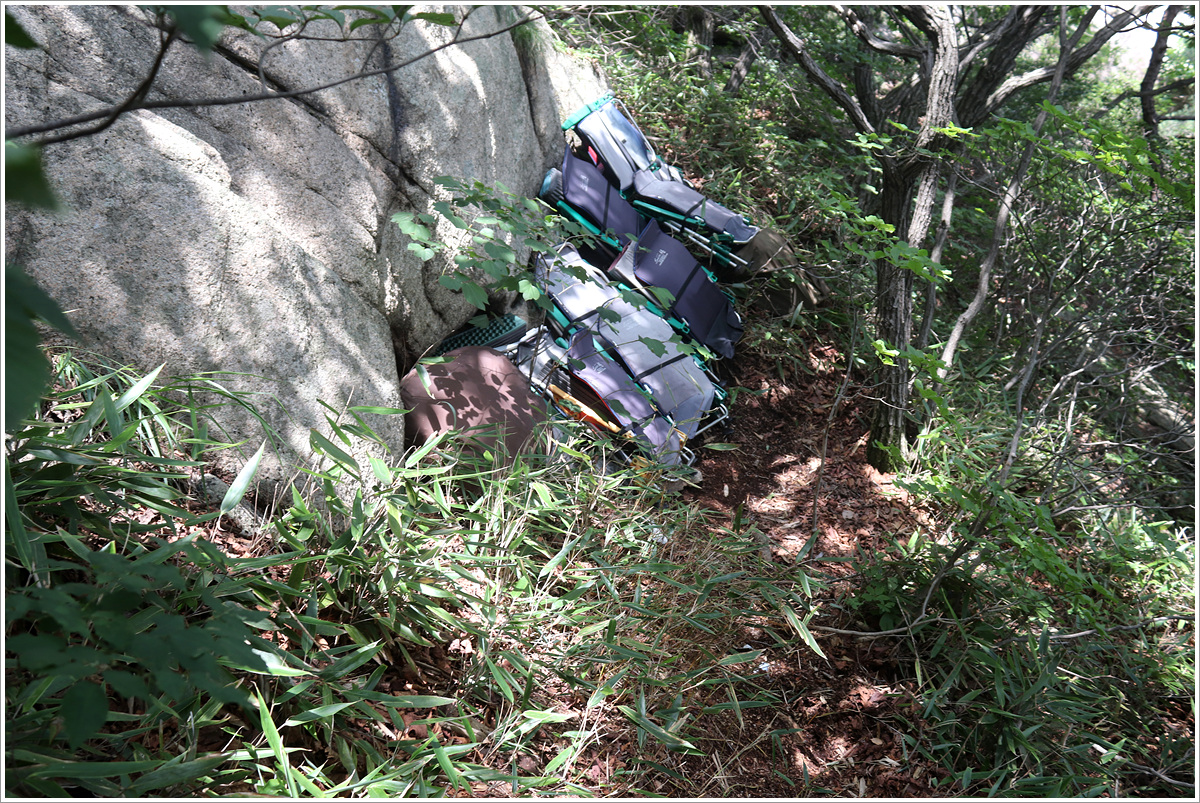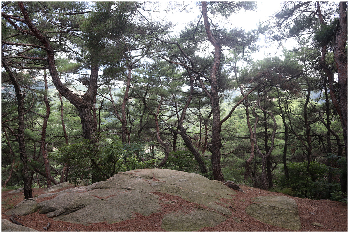 (넓적바위 쉼터라고... 잠깐 쉬어 가는데 보현봉능선이나 주능선에서 간간히 불어주던 바람도 이쪽은 전혀 없으니 그저 물만 당길 뿐 쉬는 것 같지도 않다)