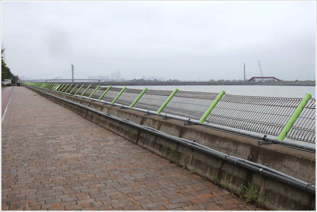(갑문이 있는 차도1교에 이른 뒤에야 끝나는 차단판넬... 즉 인천대교와 차도1교 사이에서 해안으로 진입할 수 있는 곳은 현재 전혀 없다고 보면 된다)