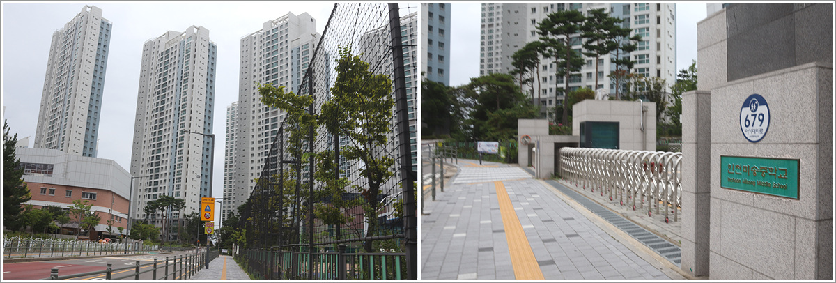 (여기서 도로가 끝나면서 좌측은 미송중학교 울타리이고 우측은 공사용 부지 차단판... 사이로 길 흔적이 보여 잠깐 들어섰다가 길이 끝나 되돌아 나온 뒤 좌측 더샵송도마리나베이 단지 진입로로 들어선다)