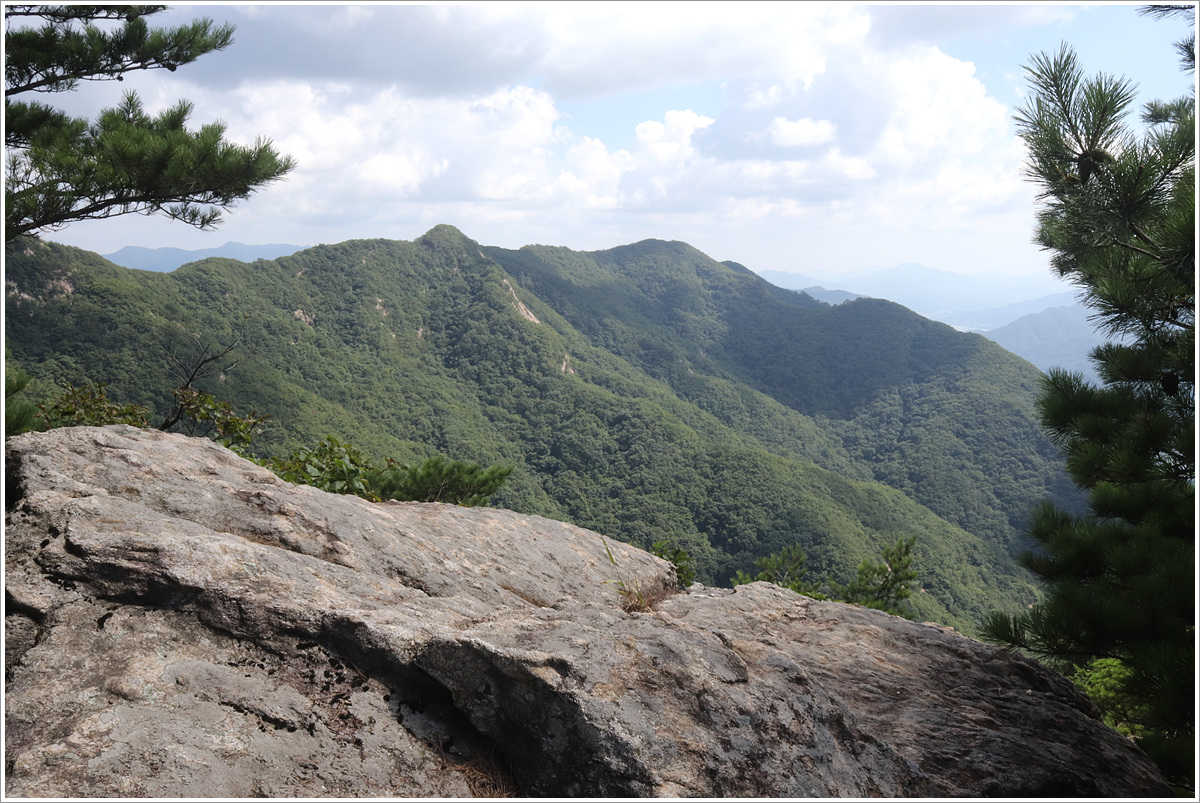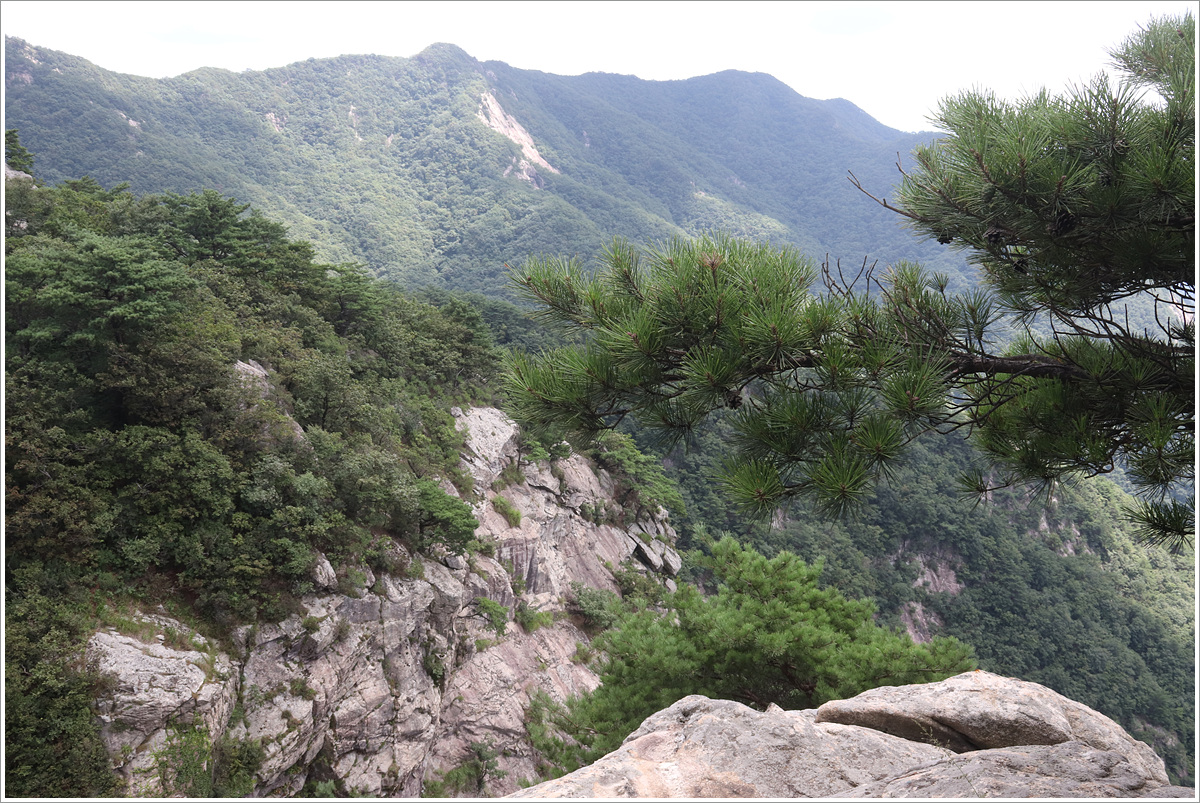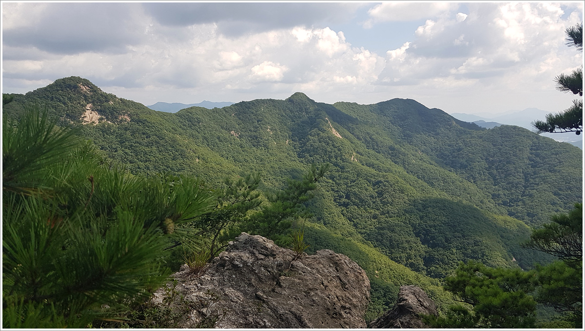 (슬랩을 오르면 지나온 망나니골 능선과 그 뒤로 금학산이 펼쳐지고)