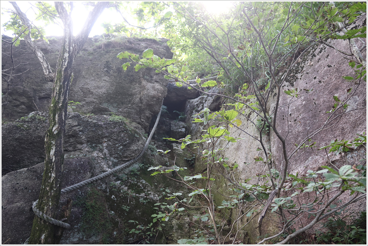 (안부로 되돌아 와 우측 흐릿한 족적을 잠깐 더 진행하니 그제서야 밧줄이 보이네... 밧줄대신 홀더 잡고 오른다)
