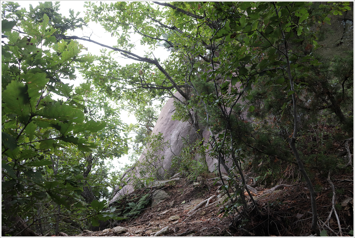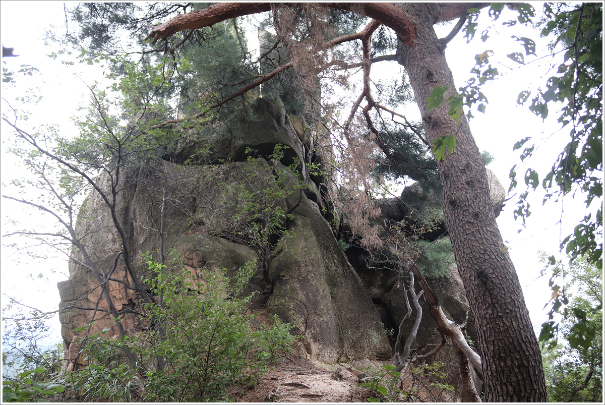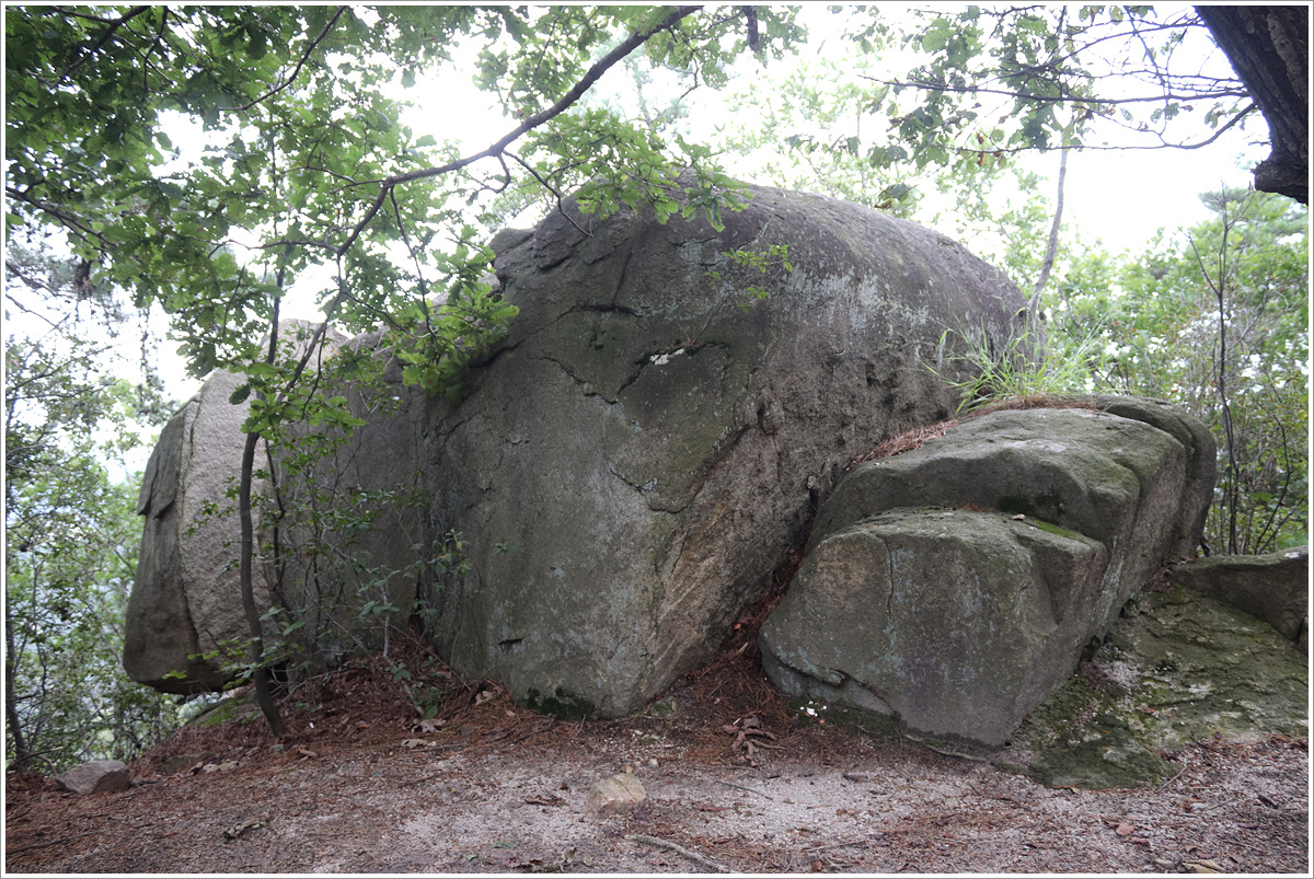 (우측 사면길로 하산... 되돌아 보니 한쪽 바위가 쪼개진 채 독특하게 생겼네. 나중에 다시 찾으면 구석구석 살펴야겠다)