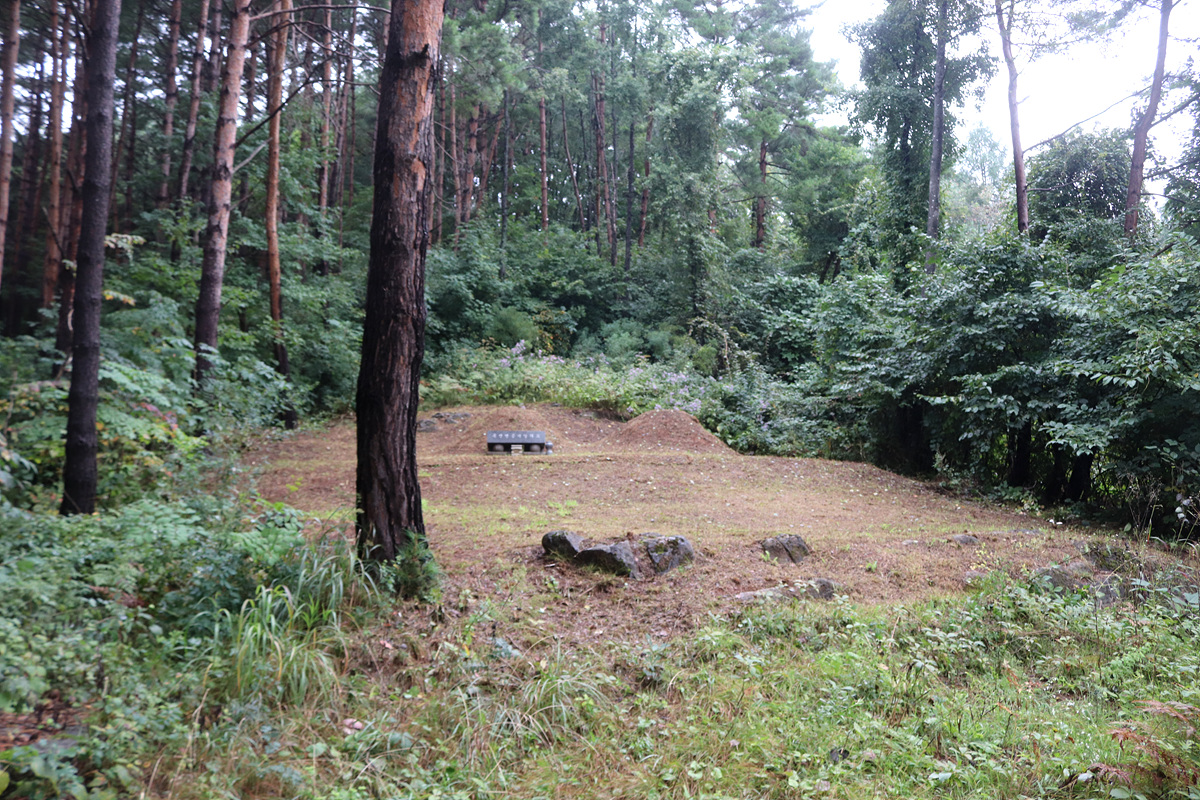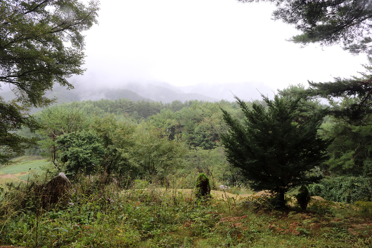 (당시 사방으로 시야가 탁 트이는 공터를 이루면서 조망이 너무 좋았다는 기록이지만 웃자란 나무들이 사방으로 둘러진 채 나무 사이로 북쪽 각희산 방향만 이 정도 조망이 트일 뿐이다)
