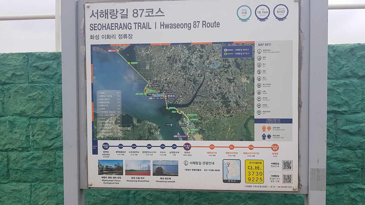 서해랑길 화성 87코스는 화성시 우정읍 이화리 버스종점을 시점으로 매향리 평화생태공원과 화성방조제를 경유 궁평항을 종점으로 하는 약 18.8km 구간이다.