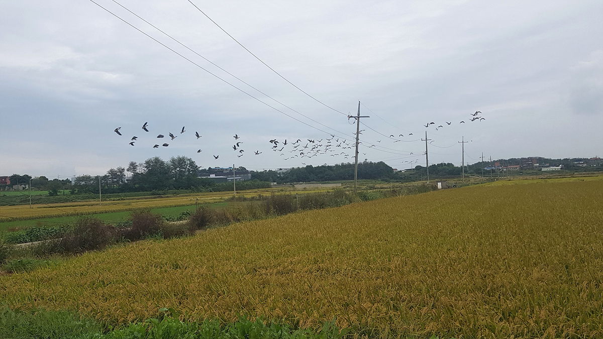 (모여였던 철새들이 인기척에 놀란 듯 날아간다)
