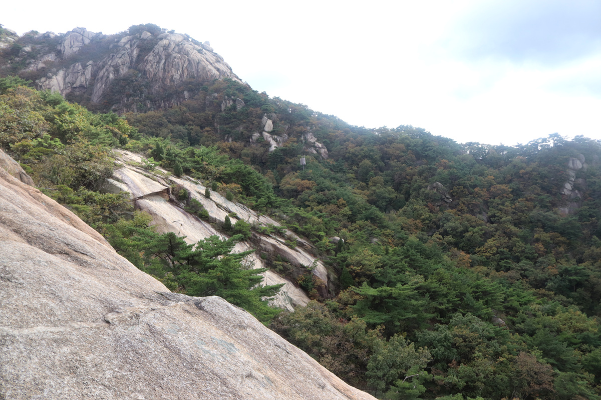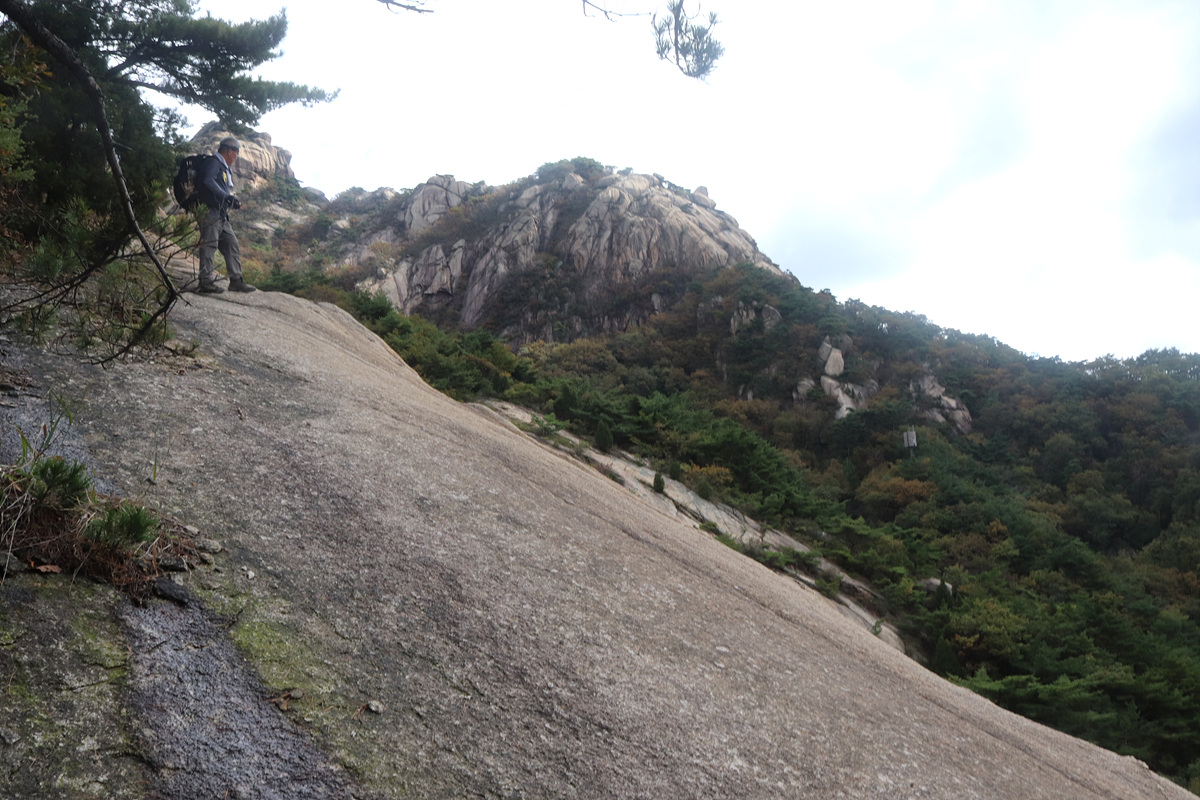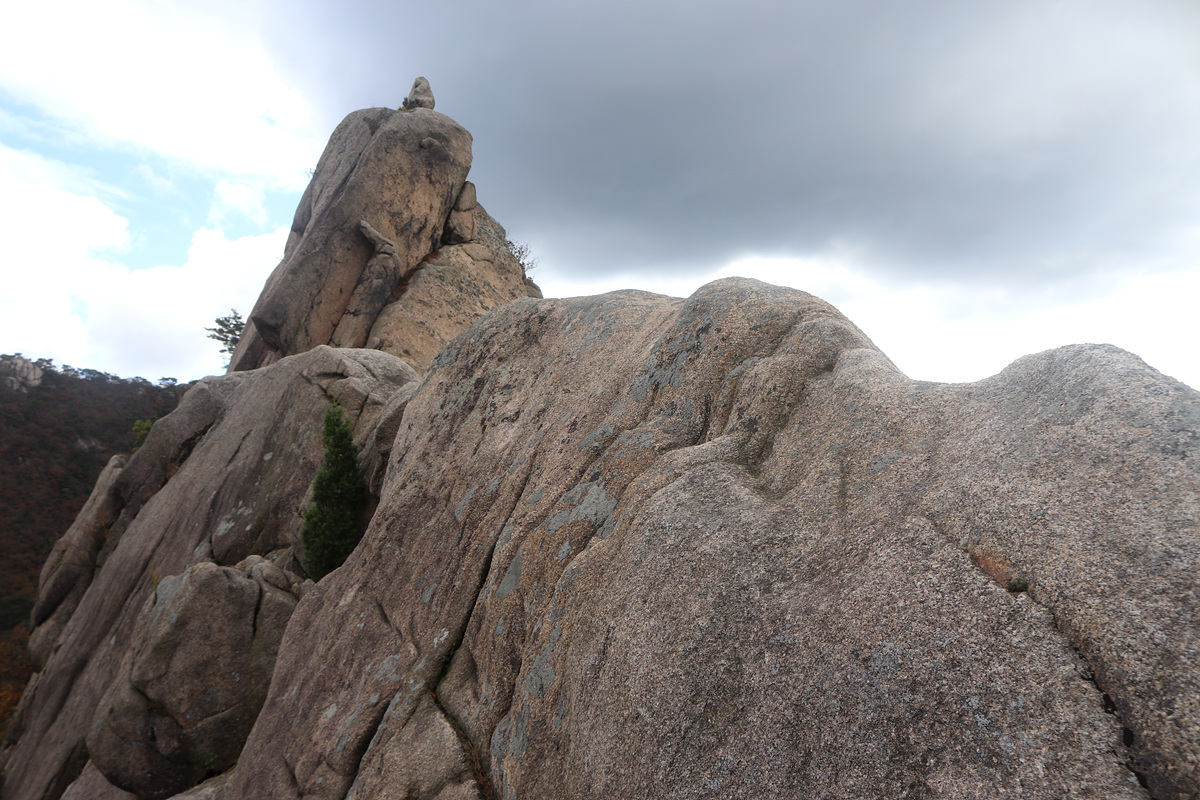 (돌아본 정상바위인데 여기서 바로 갈 수는 없고 홈통바위로 돌아가야 한다)