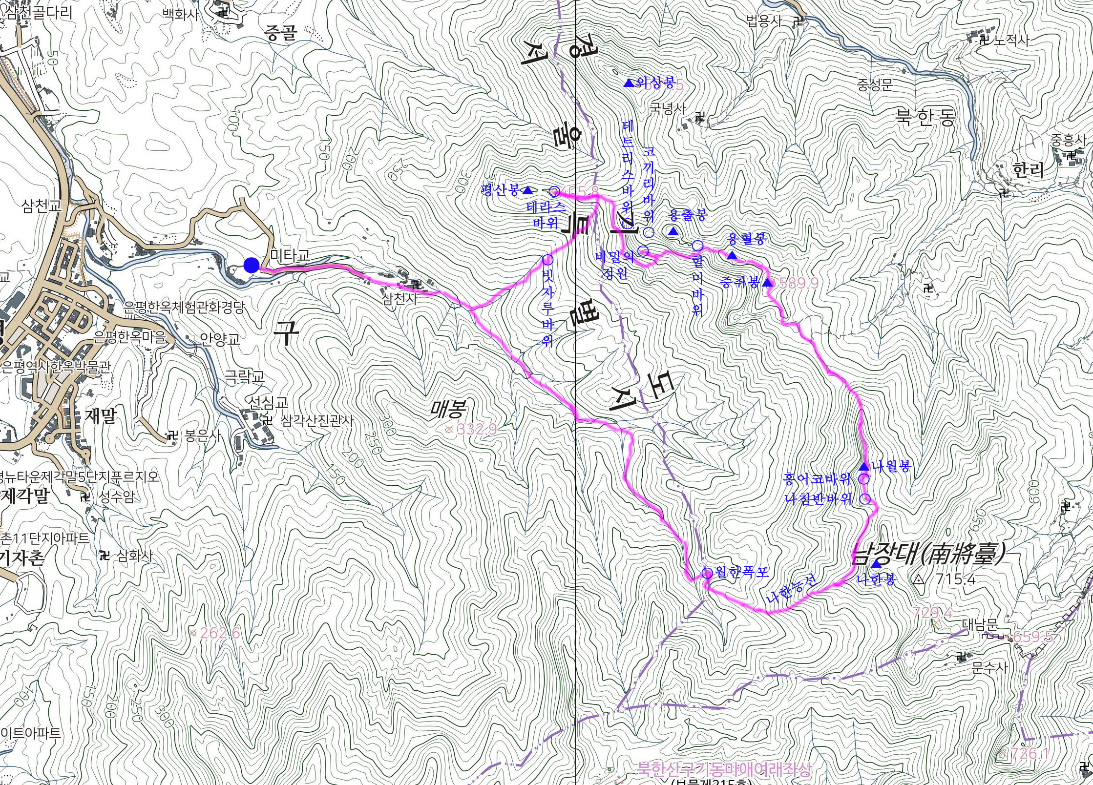 미타교-삼천사-삼천사계곡-월한폭포-나한능선-주능선-나월봉-부왕동암문-증취봉-용혈봉-할미바위-비밀의정원