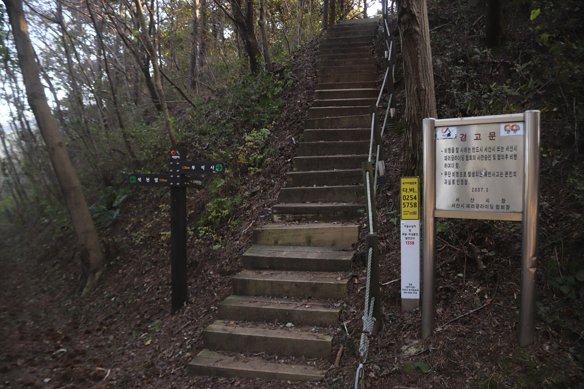 오전 홍성 죽도 여정에 이어 오후에는 상기 산줄기를 대표하는 도비산을 한 바퀴 돌아보는 여정... 부석사 입구 주차장을 출발하여 부석사와 동사를 거치는 남쪽 사면길 따라 해맞이전망대에 이른 뒤 도비산 주능선과 해넘이전망대를 경유하여 원점회귀하는 코스로 산책로가 잘 되어 있어 부담없이 진행할 수 있는 코스이다.