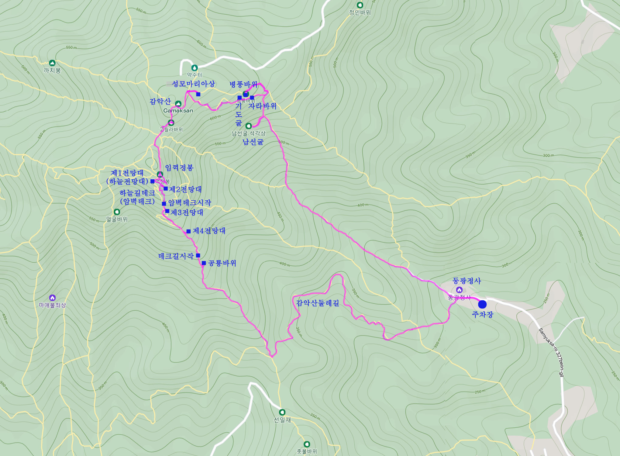 동광정사-감악산둘레길-신암리능선-공룡바위-하늘길데크-임꺽정봉-감악산-성모마리아상-기도굴-자라바위-병풍바위