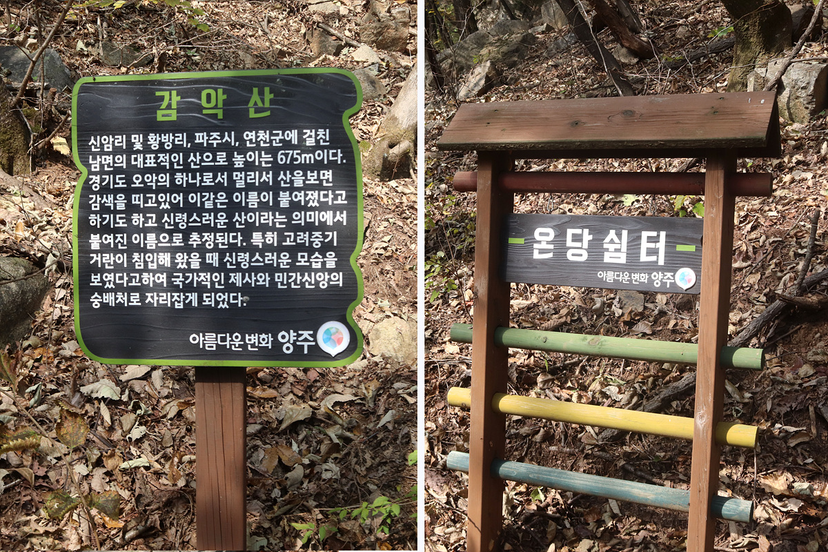 동광정사(11:19)-(감악산둘레길)-지능선(11:30)-온당쉼터(11:49)-신암리능선(12:02)-공룡바위(12:24~34)