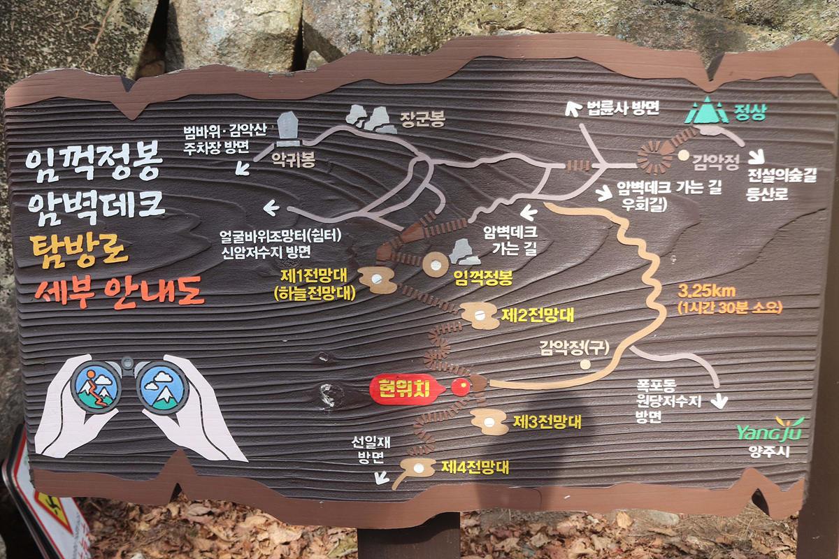 경기도 양주시, 파주시, 연천군 경계선상에 위치한 감악산... 그 중 오늘은 양주쪽 동광정사를 깃점으로 하는 코스로 길을 나선다. 동광정사를 출발하여 감악산둘레길-신암리능선-하늘길암벽데크-임꺽정봉-감악산-성모마리아상-병풍바위-남선굴을 경유한 뒤 동광정사로 원점회귀하는 코스로 거리는 짧지만 감악산의 진면을 두루 음미하면서 강한 임팩트를 남길 수 있는 코스이다.