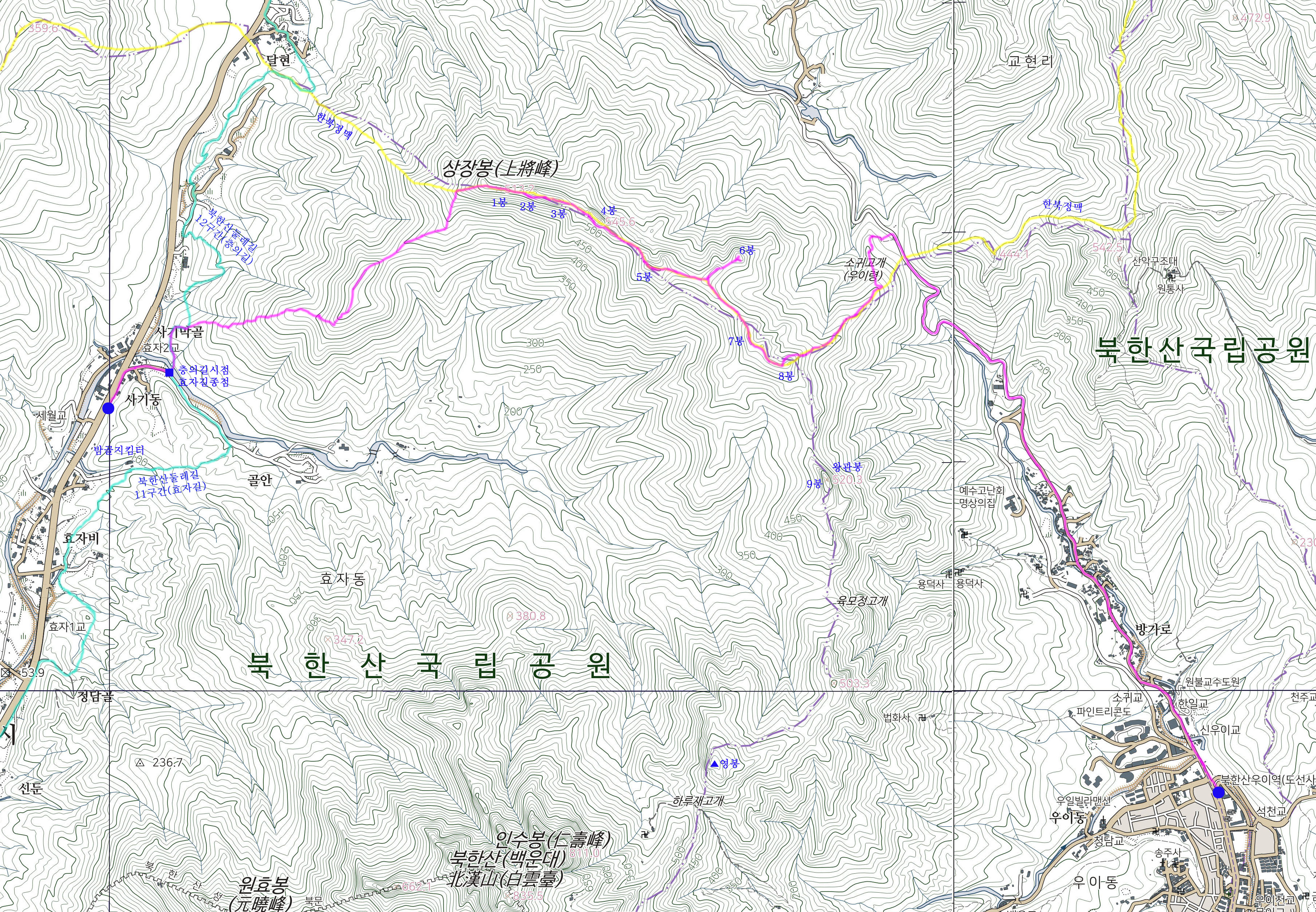 사기막골-충의길-한북정맥주능-상장봉(×513.2)-3봉-5봉-6봉왕복-7봉-8봉-소귀고개-우이령길-북한산우이역