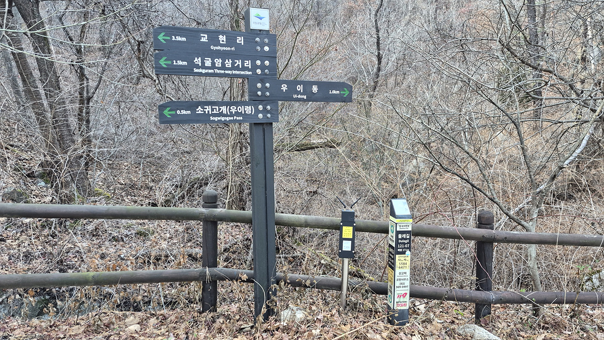 -우이령길/긴급재난안전쉼터(15:30)-소귀고개(15:33)-중간쉼터(15:36~44)-우이령탐방지원센터(16:02)
