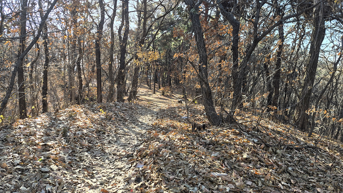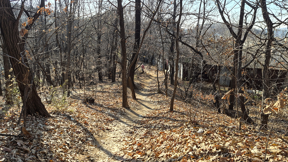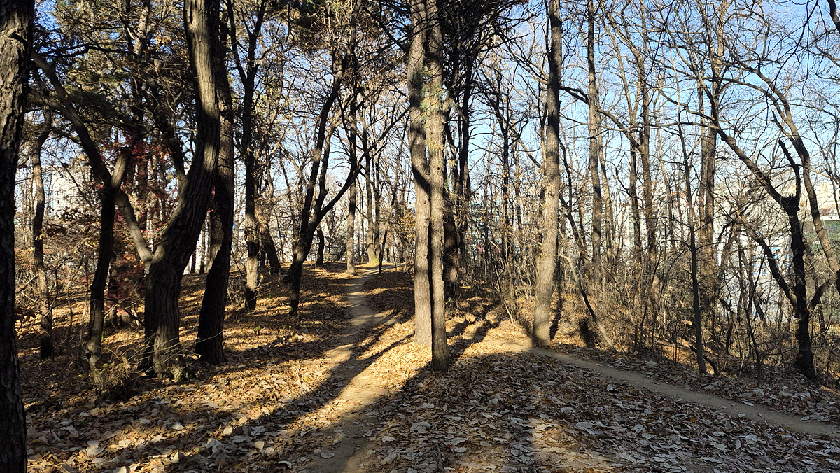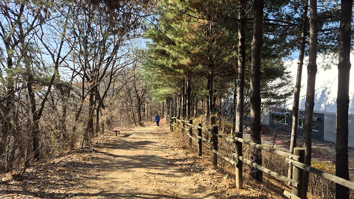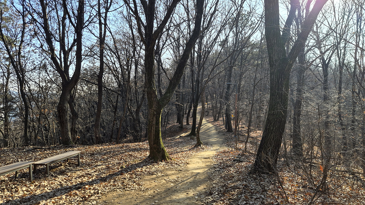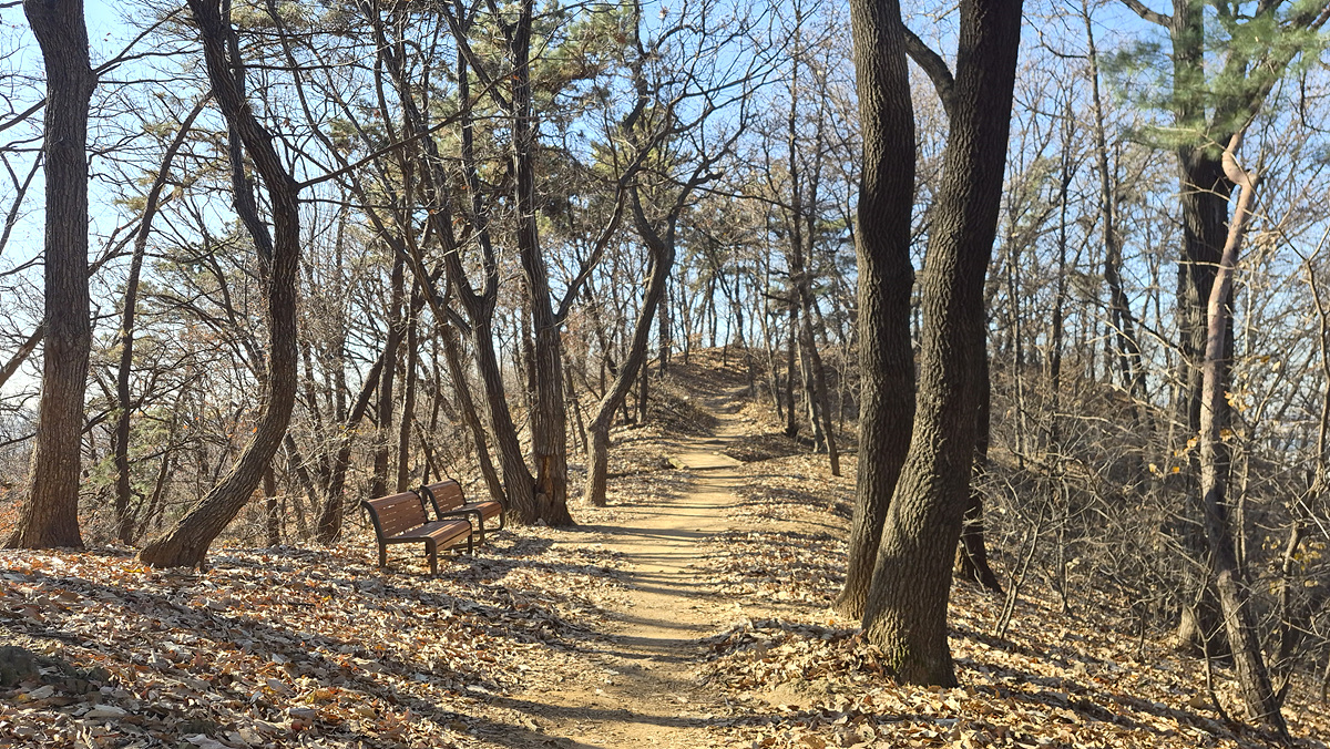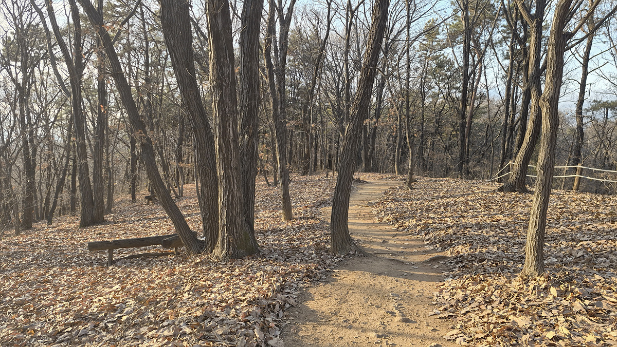 (편안하게 조성된 봉제산 둘레길을 따른다)