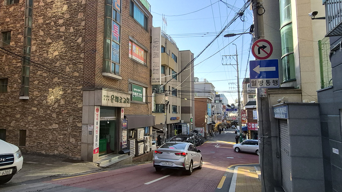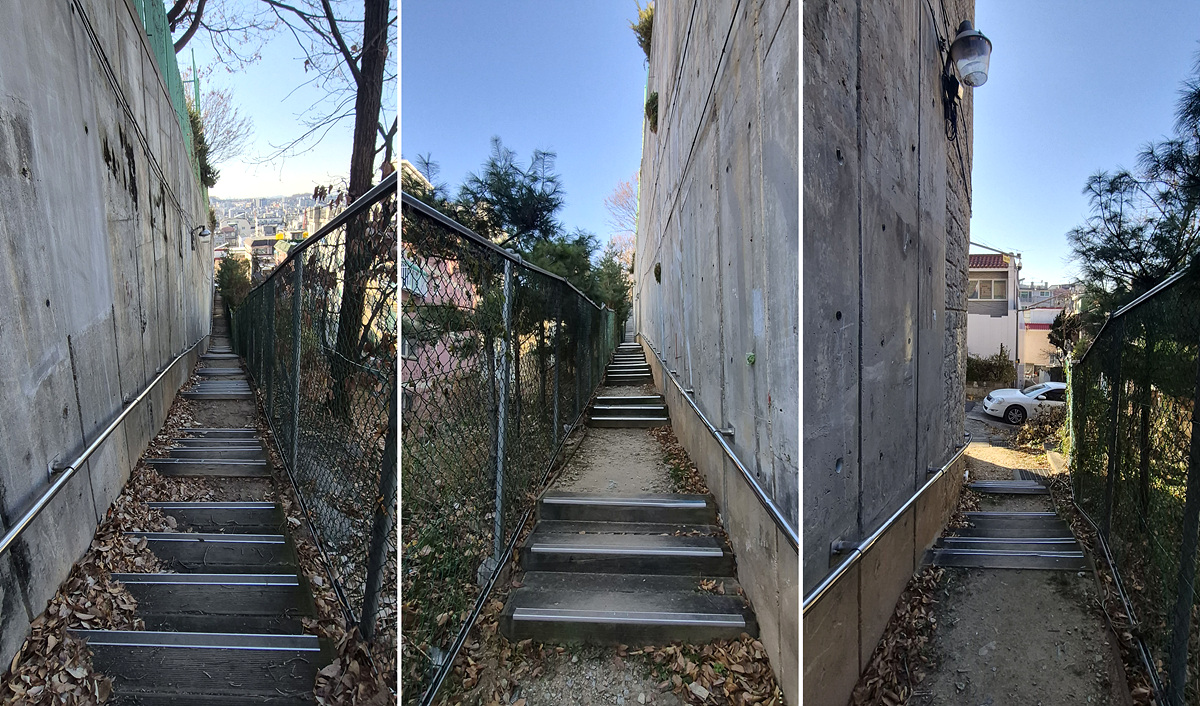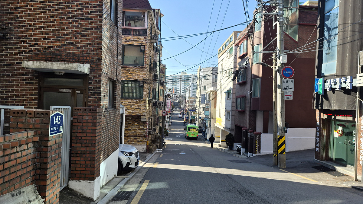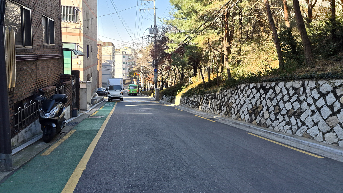 (잠깐 내려서면 날머리이자 카카오/네이버맵상 봉제산 등로가 표기되어 있는 럭키빌라 앞이다)