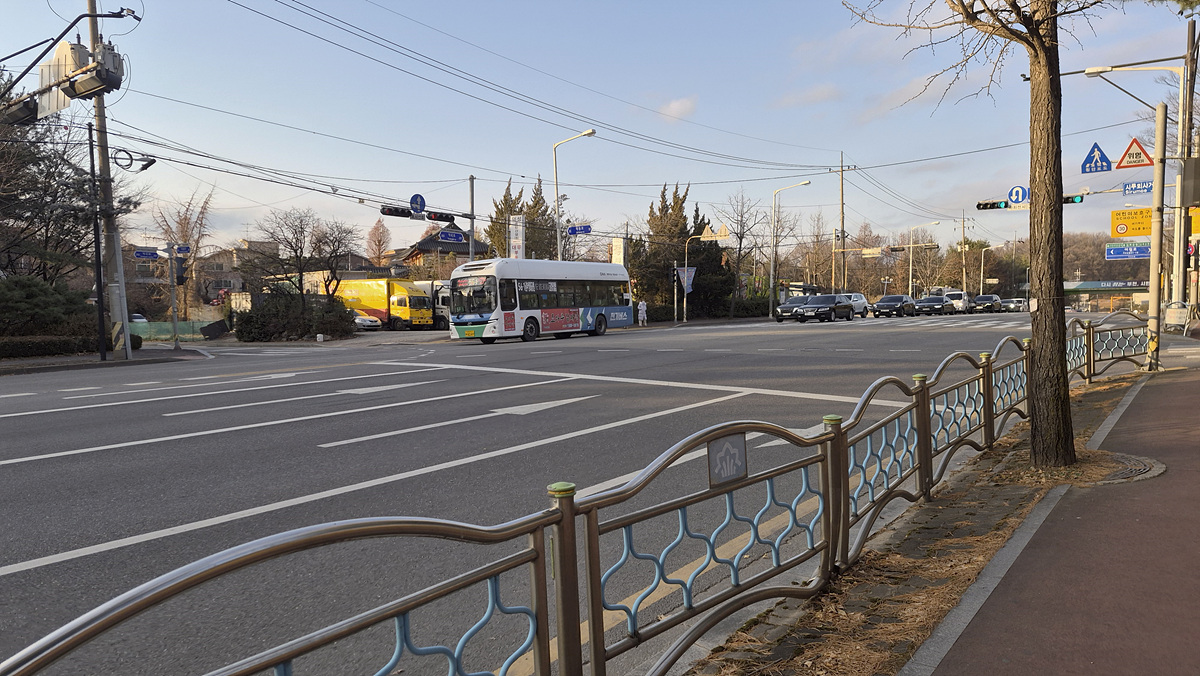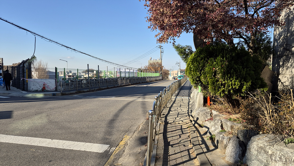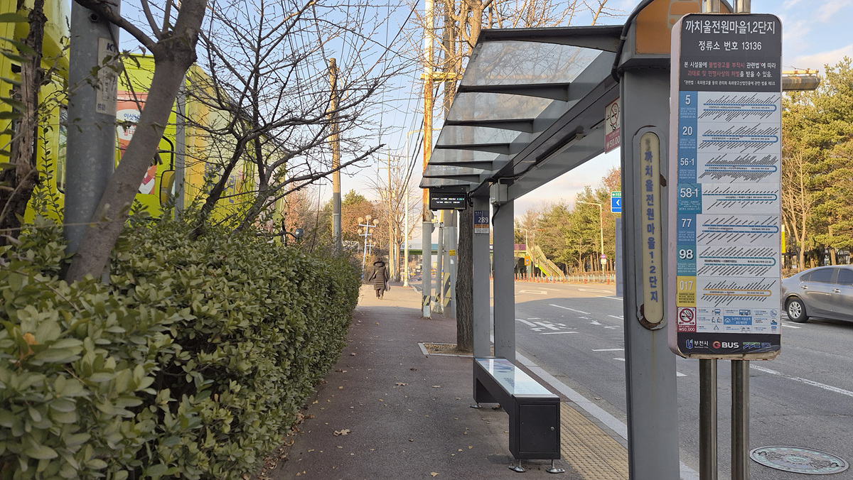 (횡단보도 건너편 까치울 전원마을1,2단지 버스정류장에서 여정을 마무리하고 버스를 기다린다)