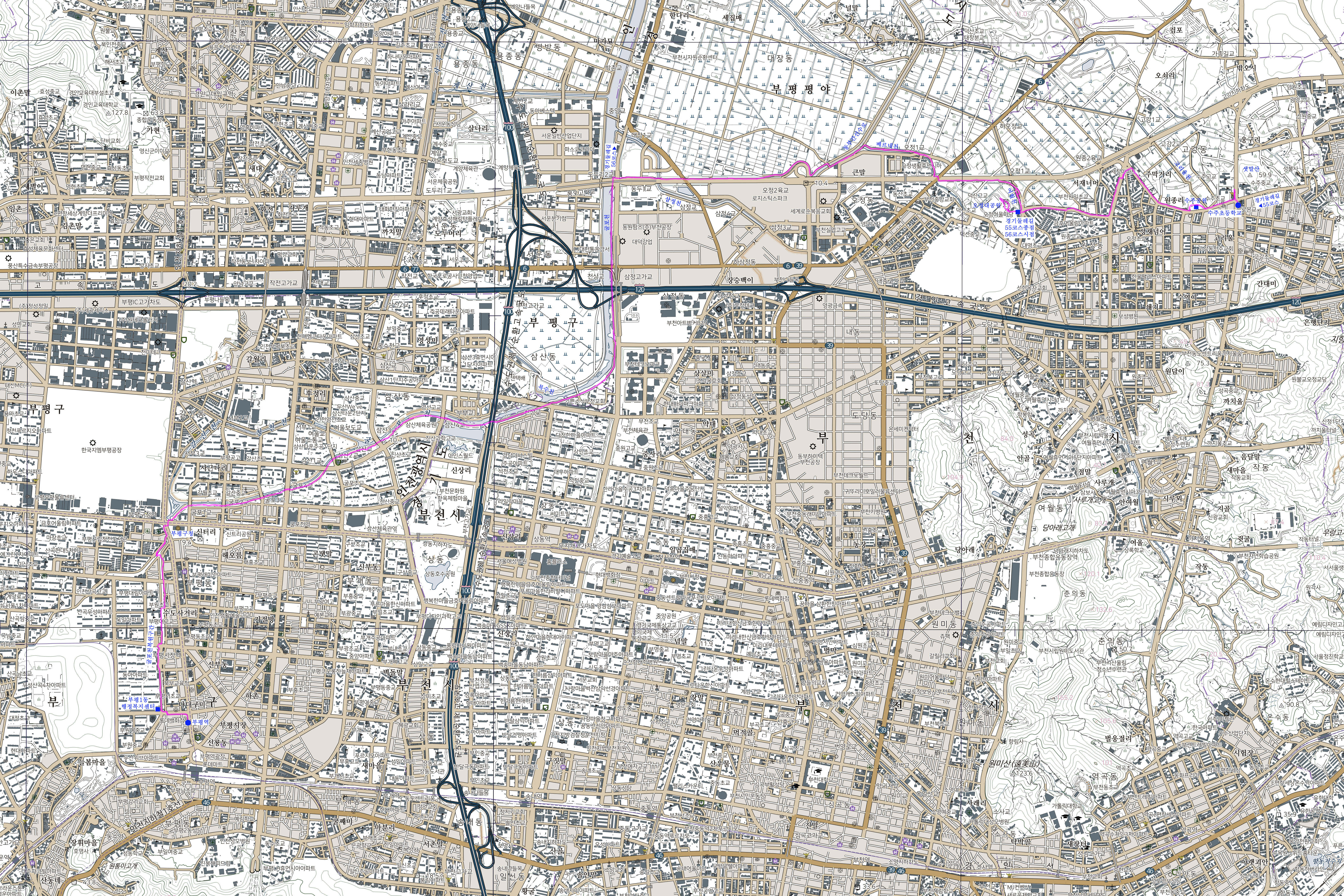 -경인고속도로/천상교(13:52)-지역난방공사삼거리/부천지류(13:59)-서운교(14:08)-평천로/신상교(14:12)