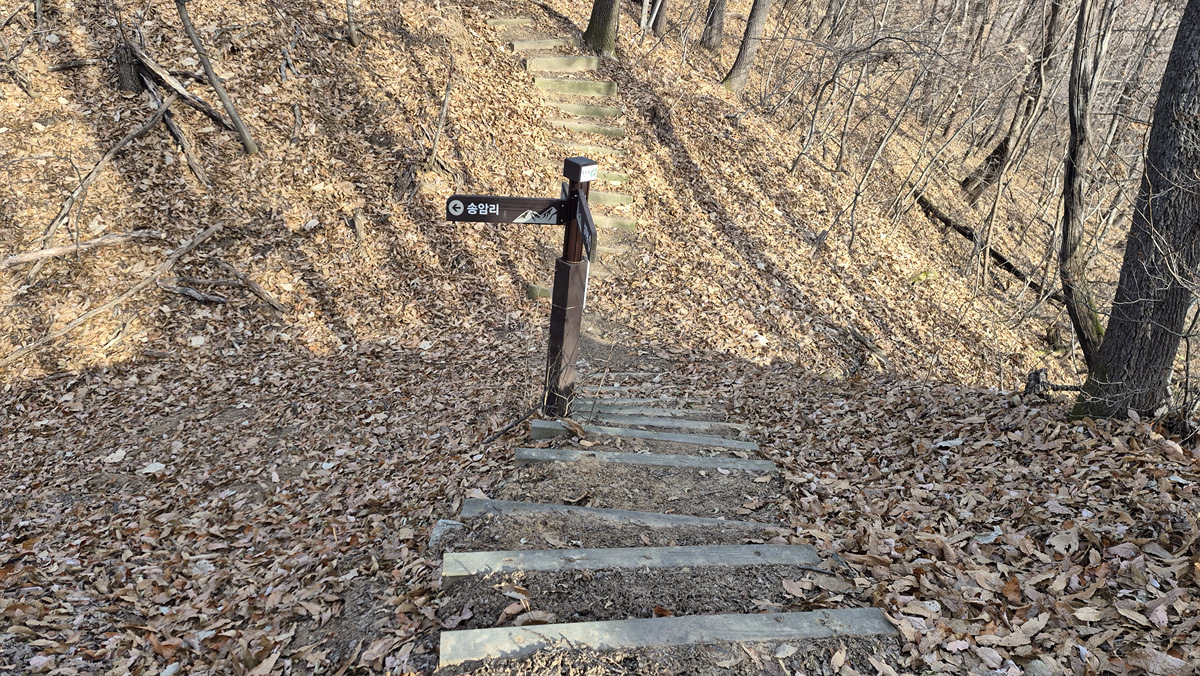 (네 갈래 하산길 중 가장 우측인 약수터 코스를 택하기로 한다)
