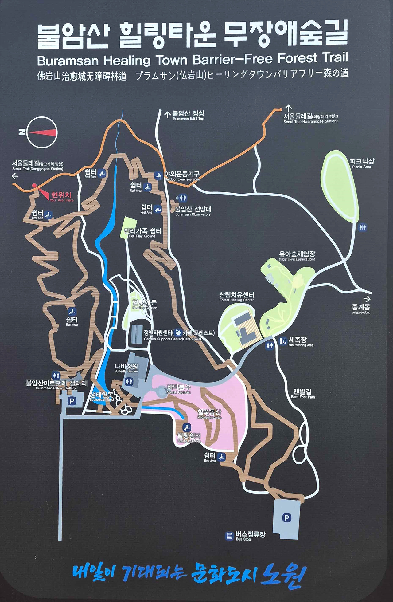 불암산역-상계나들이철쭉동산-엘리베이터전망대-학도암입구-백세문-화랑대역-묵동천-신내여울공원-신내역