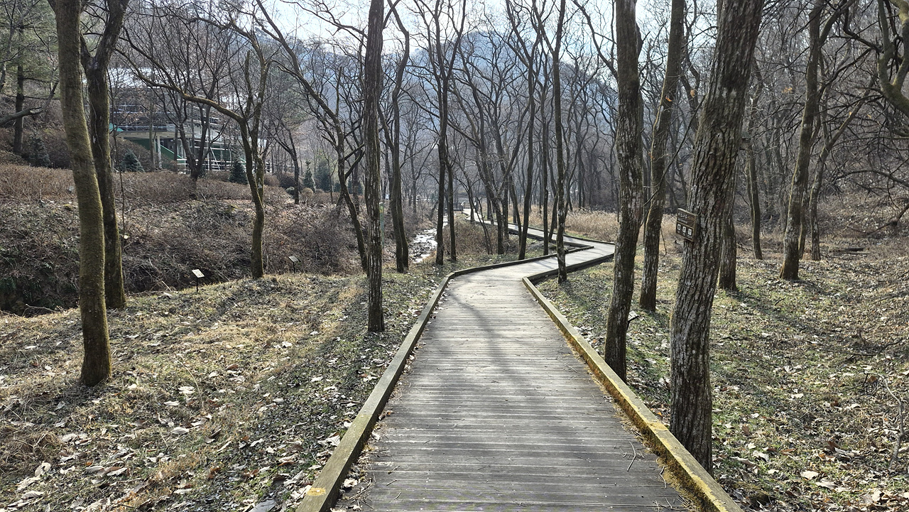 -무장애나눔길(13:41)-관리사무소(13:49)-목연교(13:54)-안내소(14:00)-주차장(14:02)-백야마을(14:06)