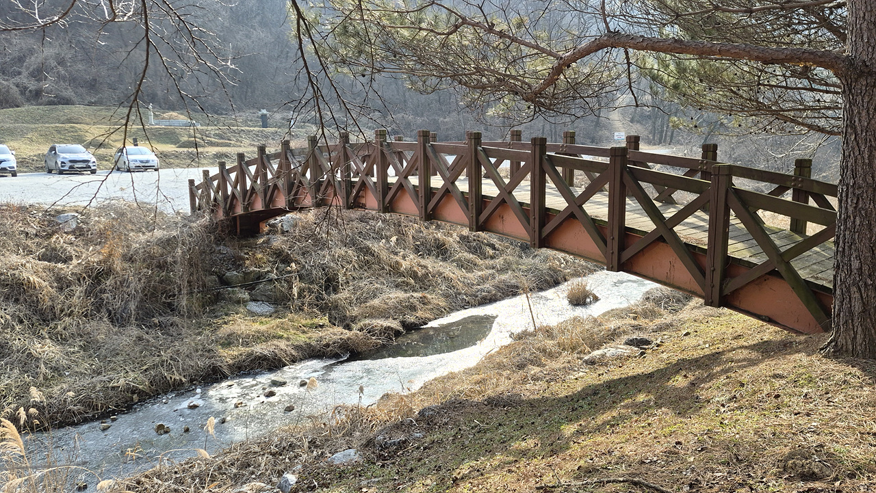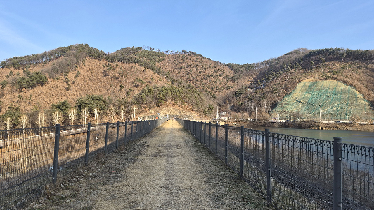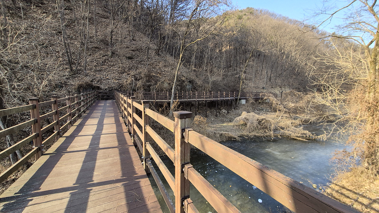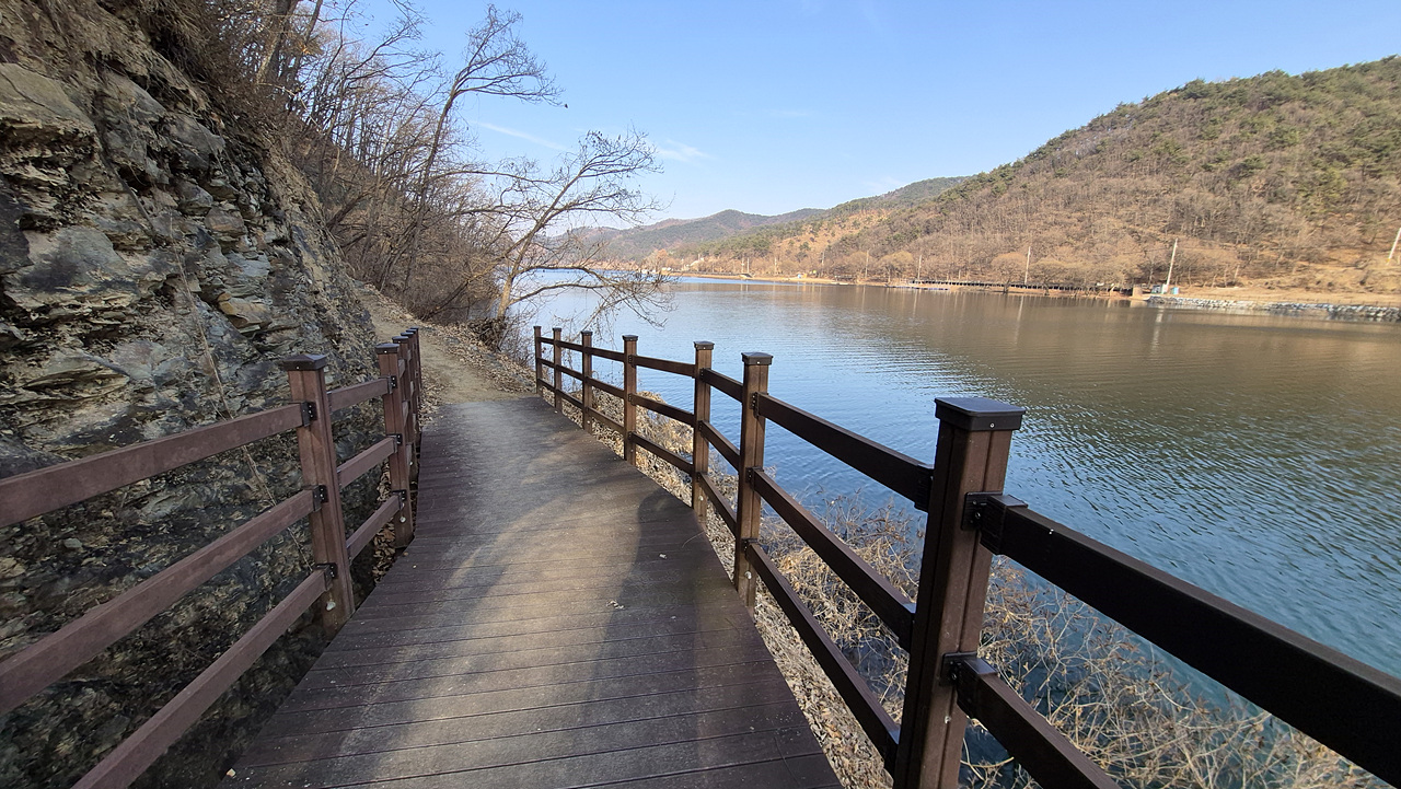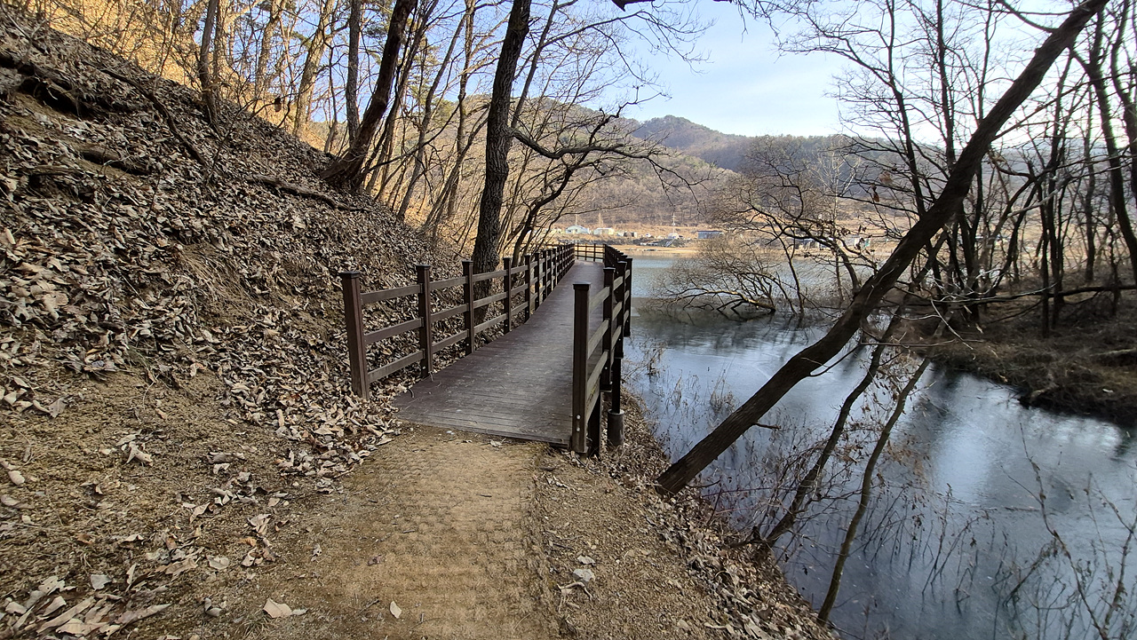 (용계저수지 둘레길 도착... 저수지를 건너는 목교가 있는 곳이다)
