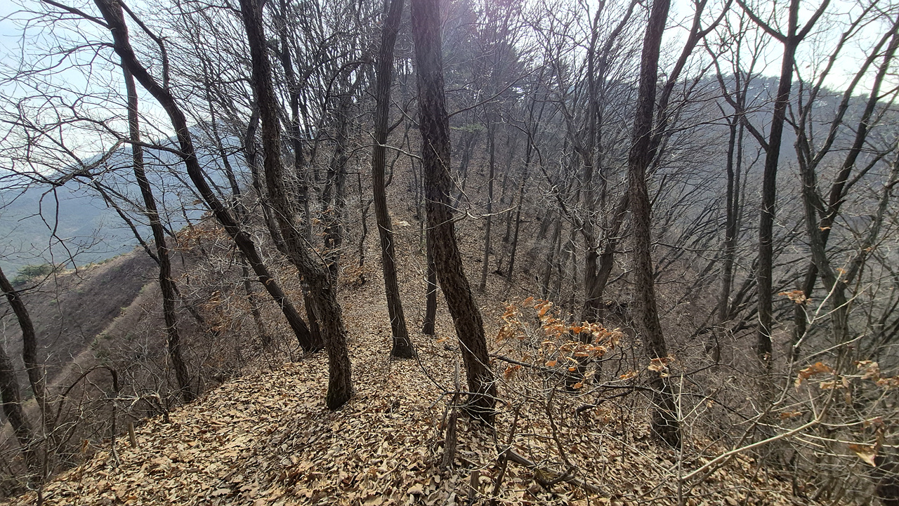 (산허리 임도쪽으로 뚜렷한 길이 이어지니 주저없이 길 따라 내려선다)