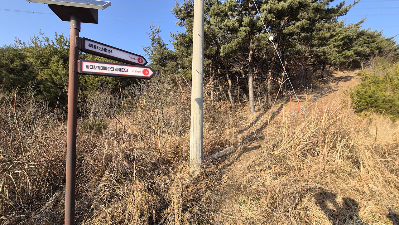 구봉도에서 돌아오는 길은 당시 해안으로 진행하면서 누락된 서해랑길 본래의 코스를 따라 북망산에 이른 뒤 이후는 대부바다향기테마파크로 이어지는 대부해솔길 1-1코스를 경유하여 원점회귀하기로 했다.