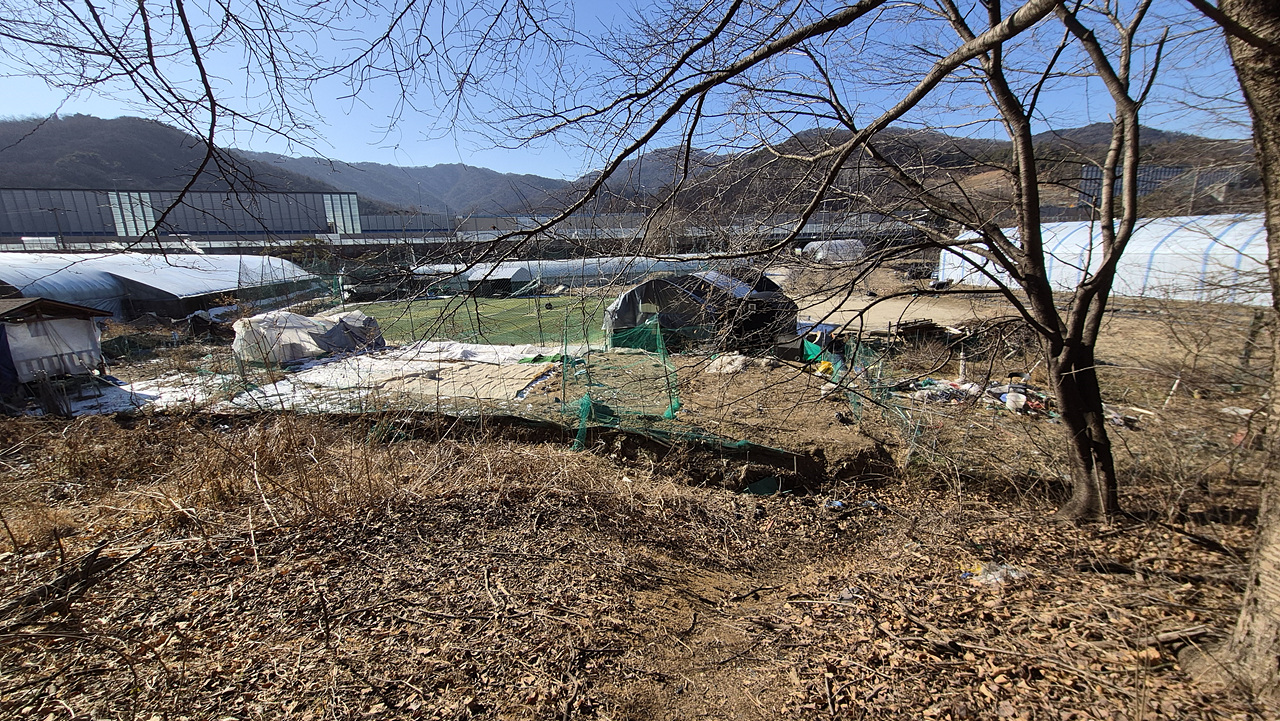 (심곡동으로 바로 가는 길은 사유지 울타리에 막혀 있고)