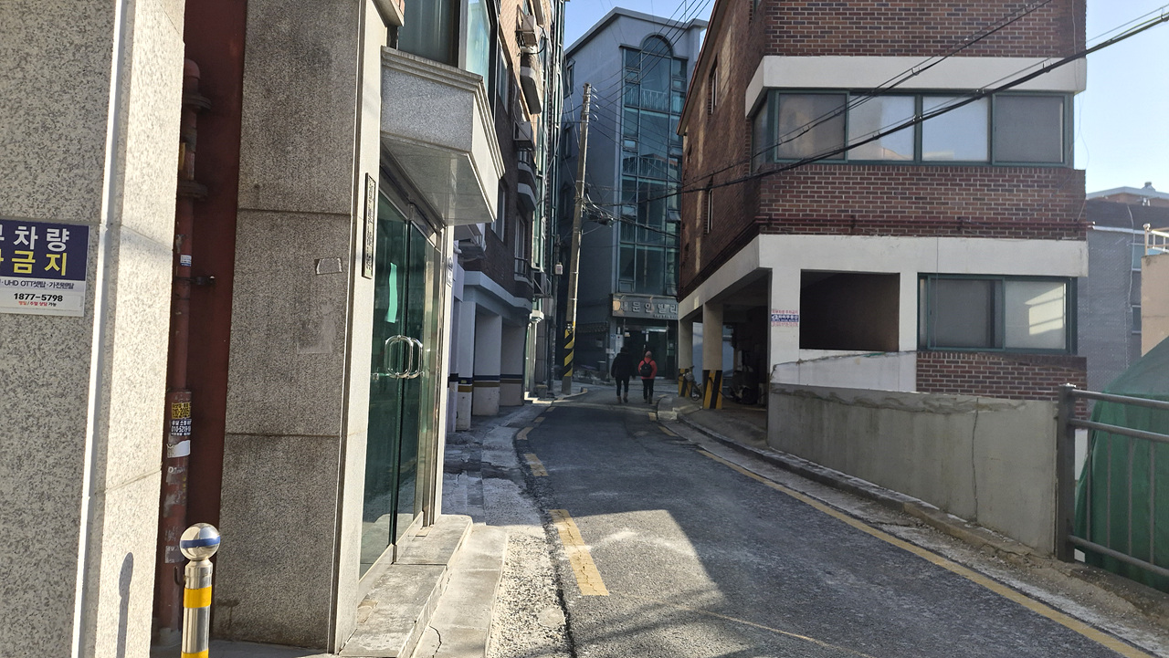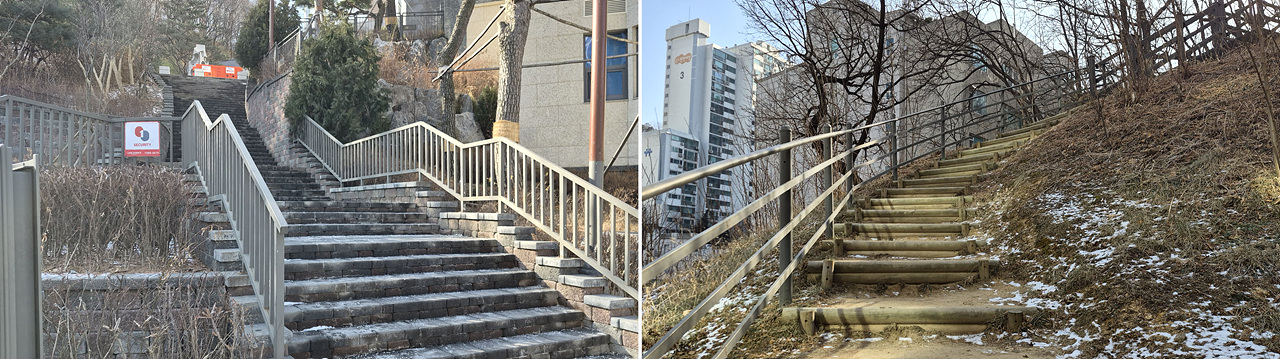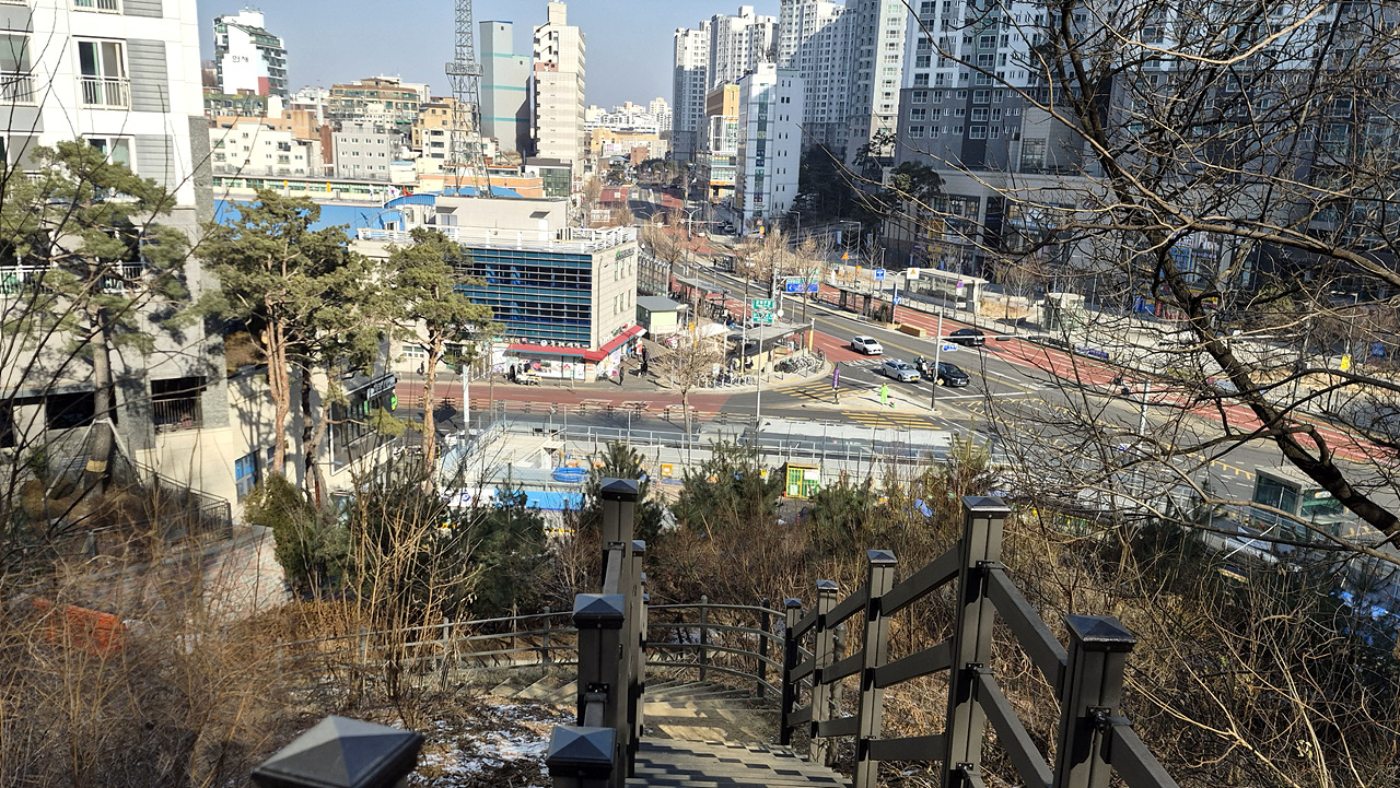 (녹번역 3번 출구를 나와 힐스테이트녹변역 아파트로 이어지는 계단길이 산길 들머리이다)