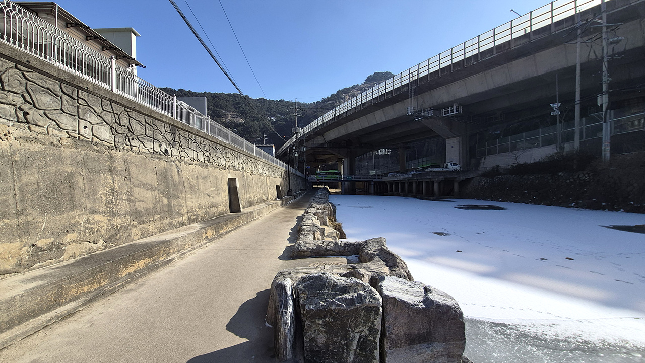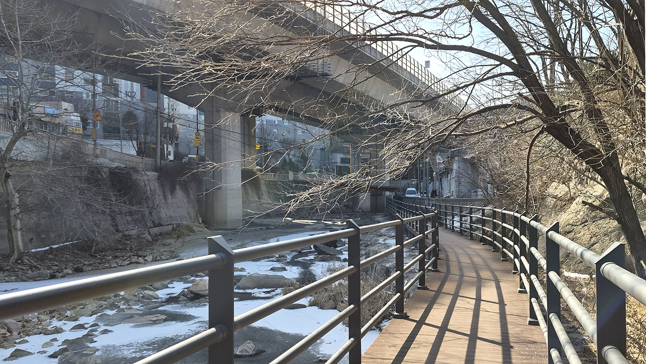 (옥천3교에서 홍제천을 나와 다리 건너고)