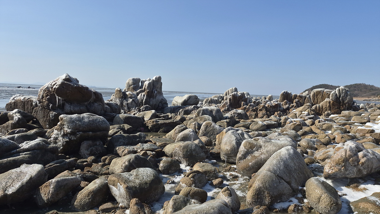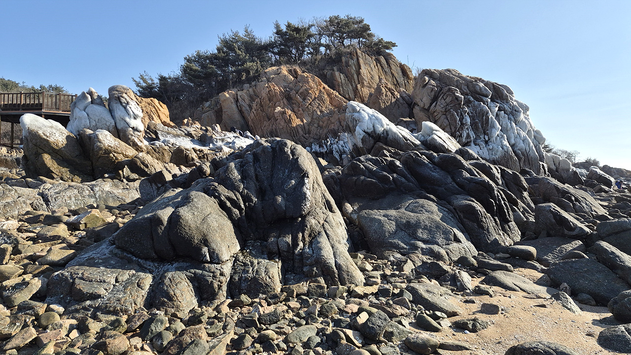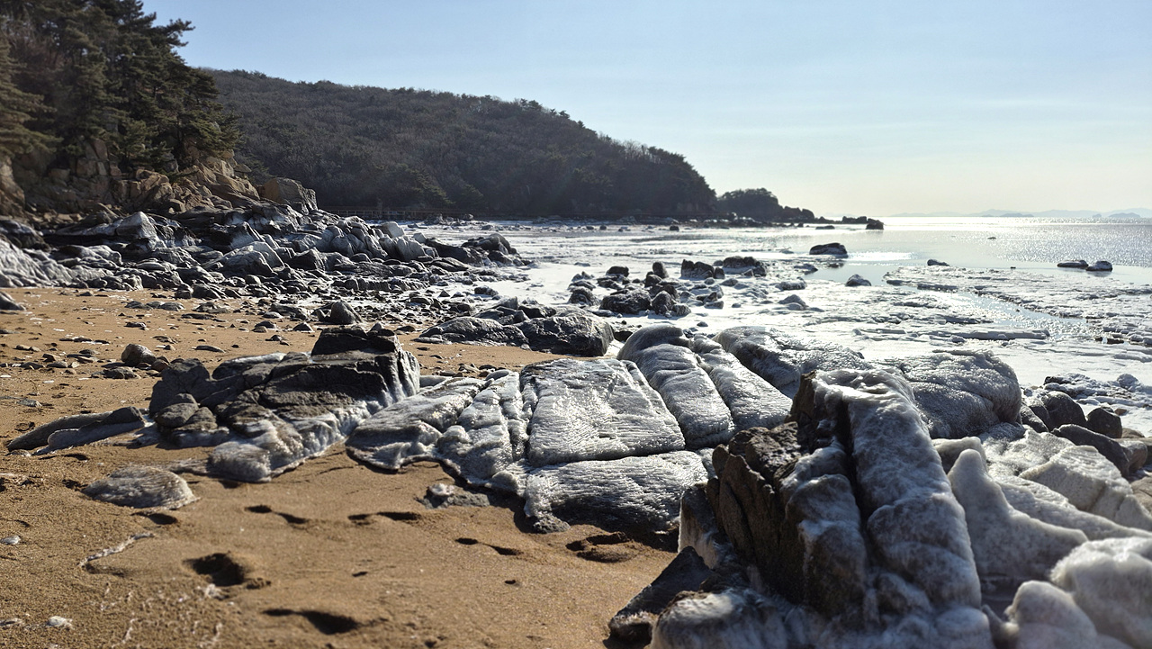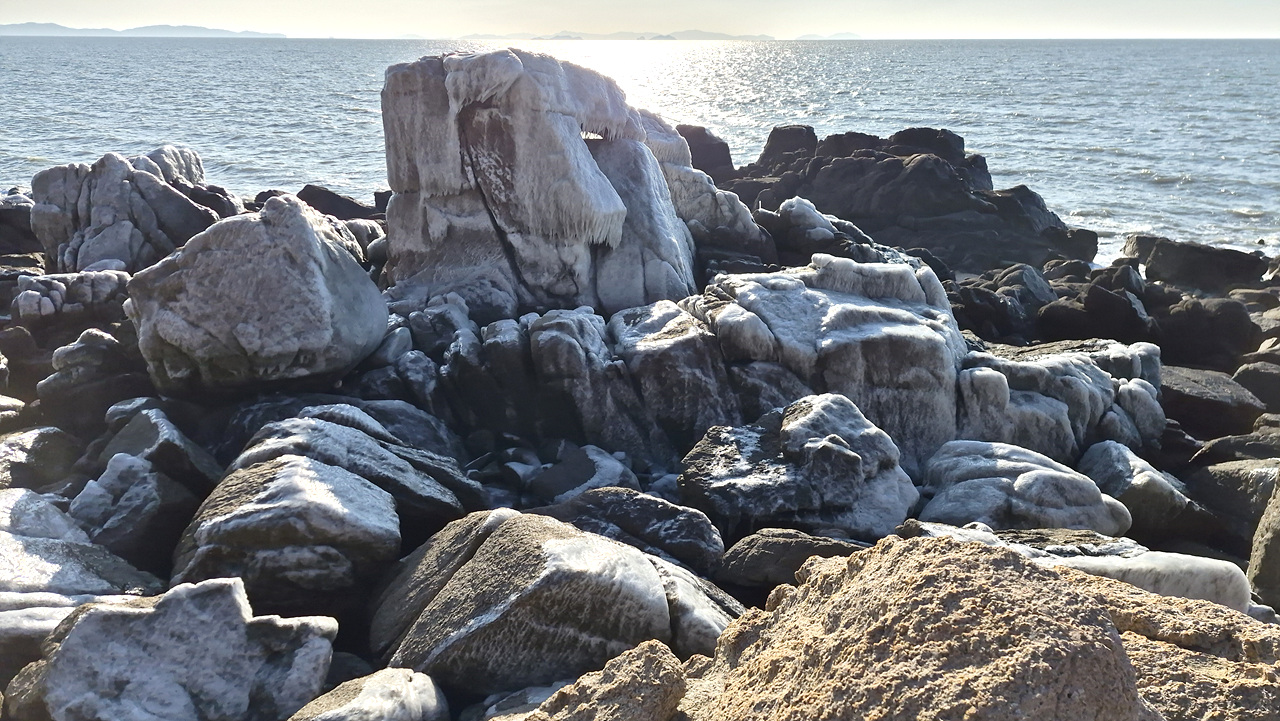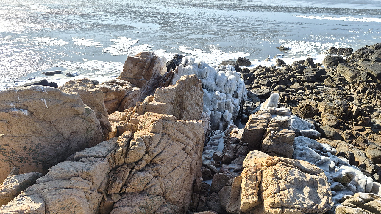 (그런데 날씨가 얼마나 추웠는지 해안 바위들이 다 얼어 빙벽을 이룬 상태)