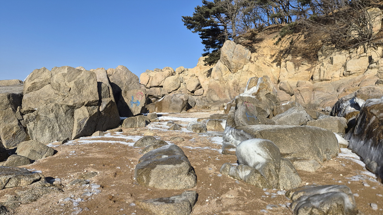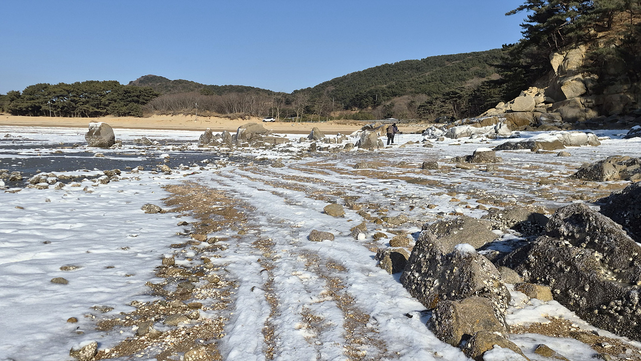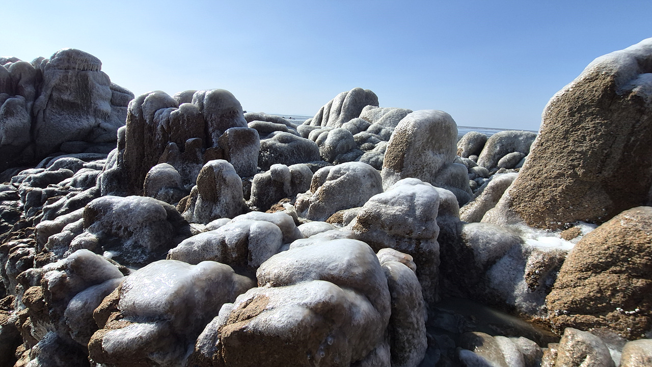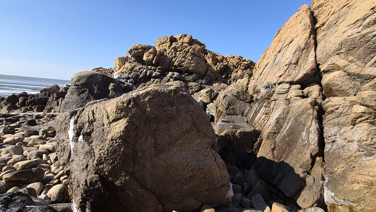 (그런데 날씨가 얼마나 추웠는지 해안 바위들이 다 얼어 빙벽을 이룬 상태)