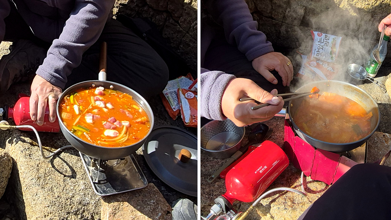 (바람 막아주는 바위벽 아래 차지하고 일행분이 기막히게 맛있다고 예고했던 김치찌개를 개봉한다)