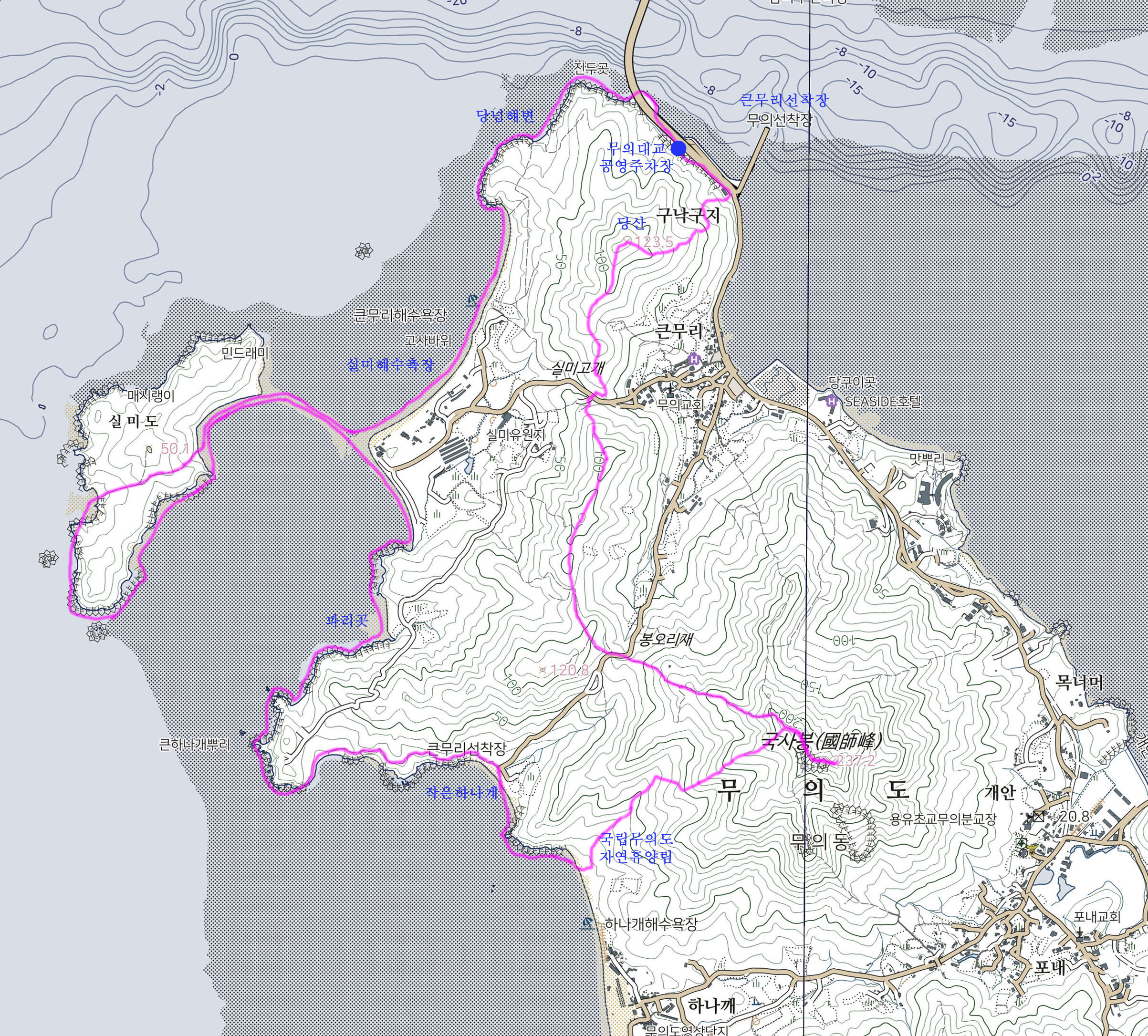 무의대교공영주차장-큰무리선착장-당산(×123.5)-실미고개-봉오리재-국사봉(×237.2)-무의도자연휴양림