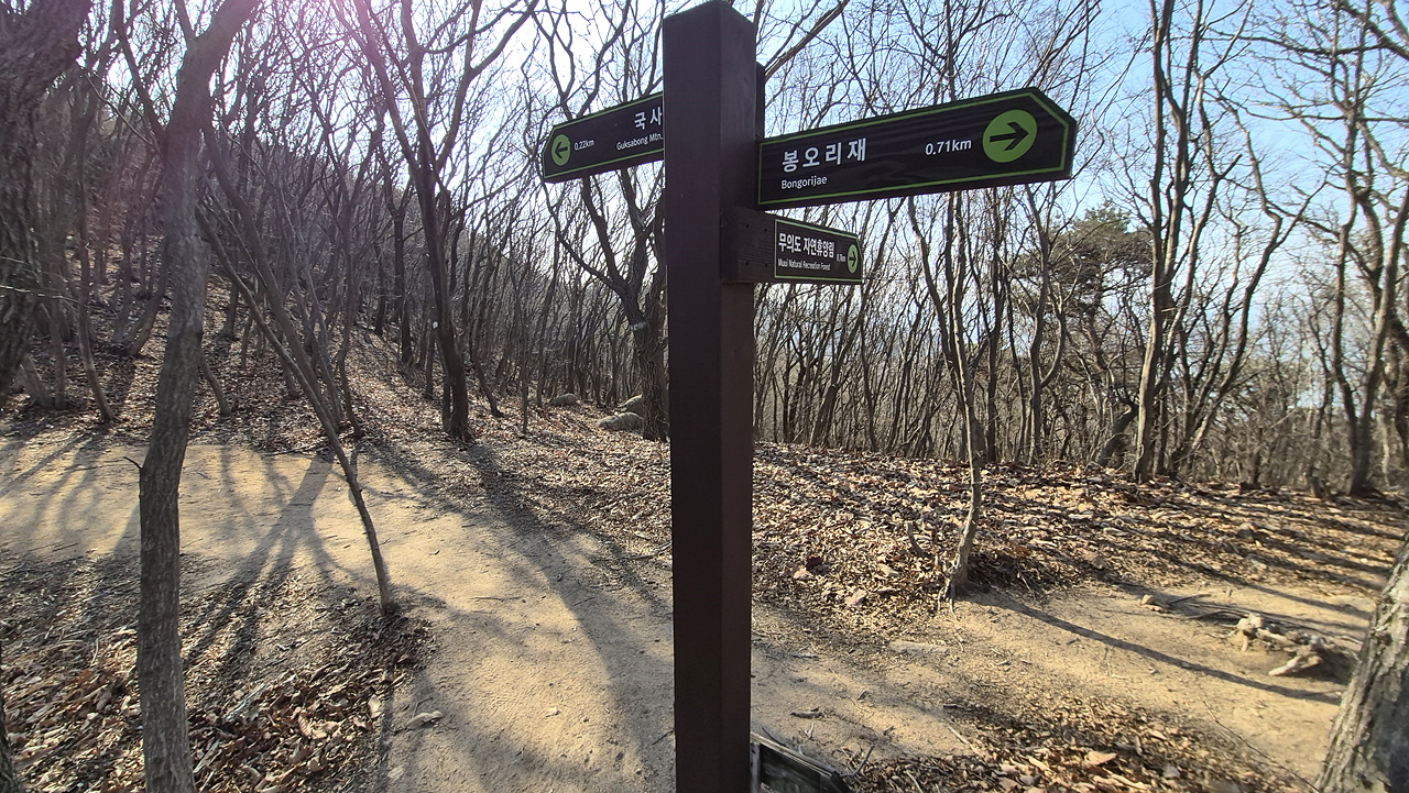 -큰무리마을갈림(09:58)-헬기장(10:01)-봉오리재(10:03)-전망바위(10:17)-큰무리마을갈림(10:21)